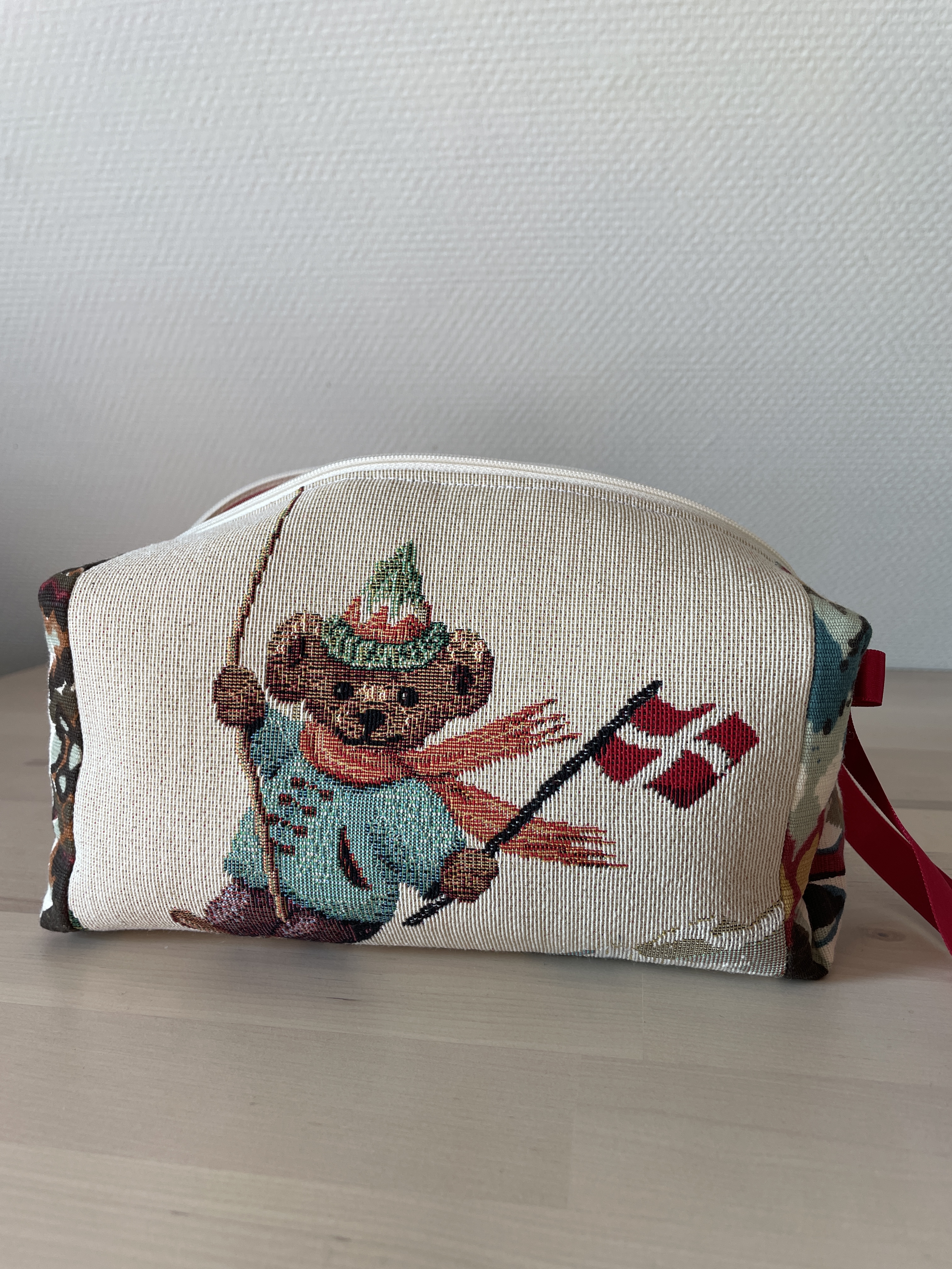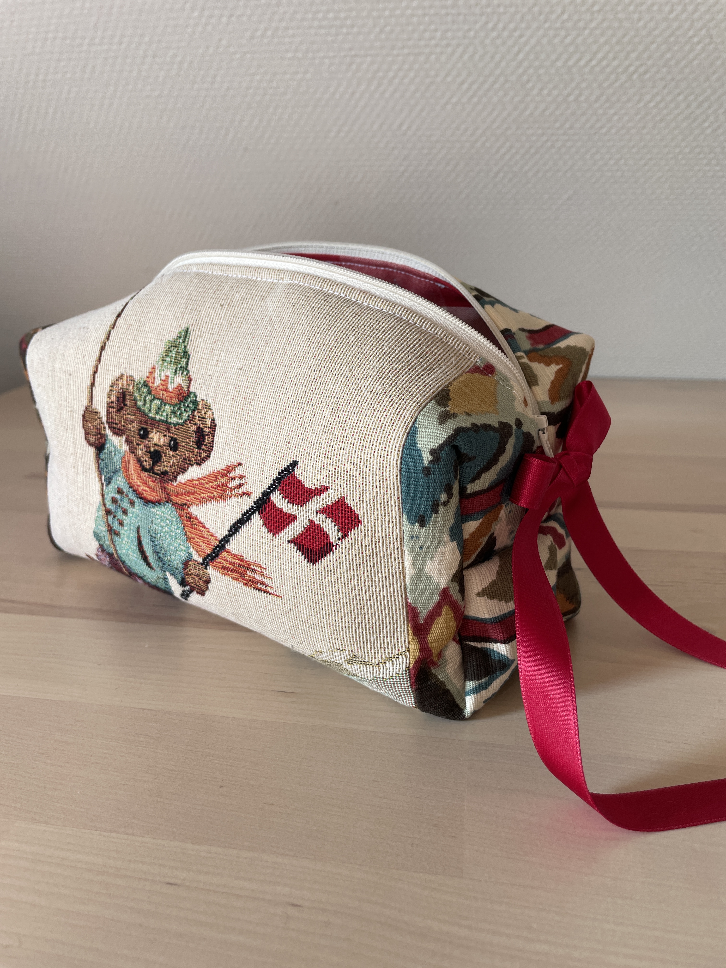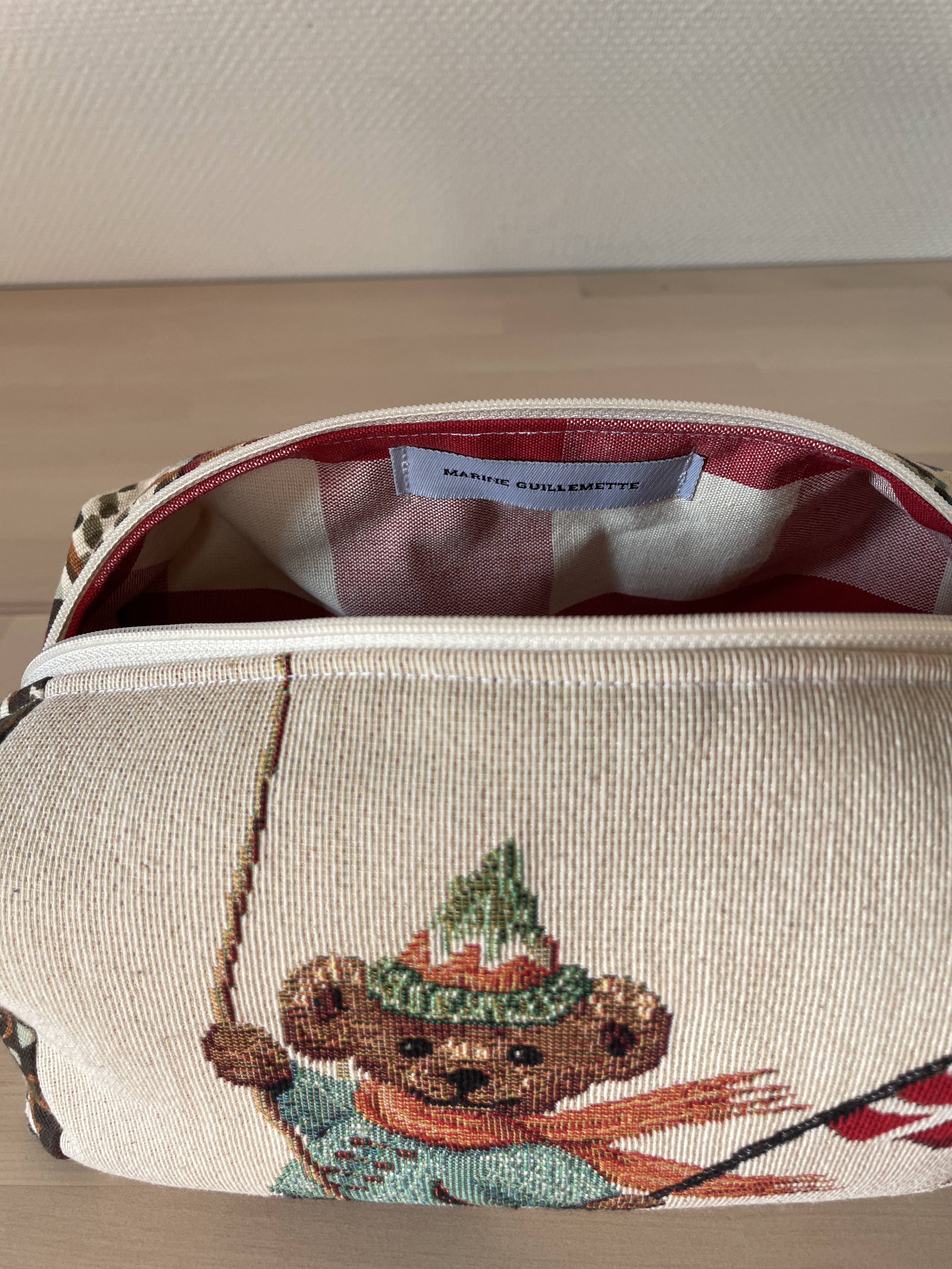 Cette trousse de beauté est confectionnée à l’aide de jacquard vintage au motif ourson et associée à un coton aztèque. Celle-ci est doublée dans une coton à grand carreau rouge. Cette trousse est unique et possède un ruban satiné rouge sur la bout de la fermeture.