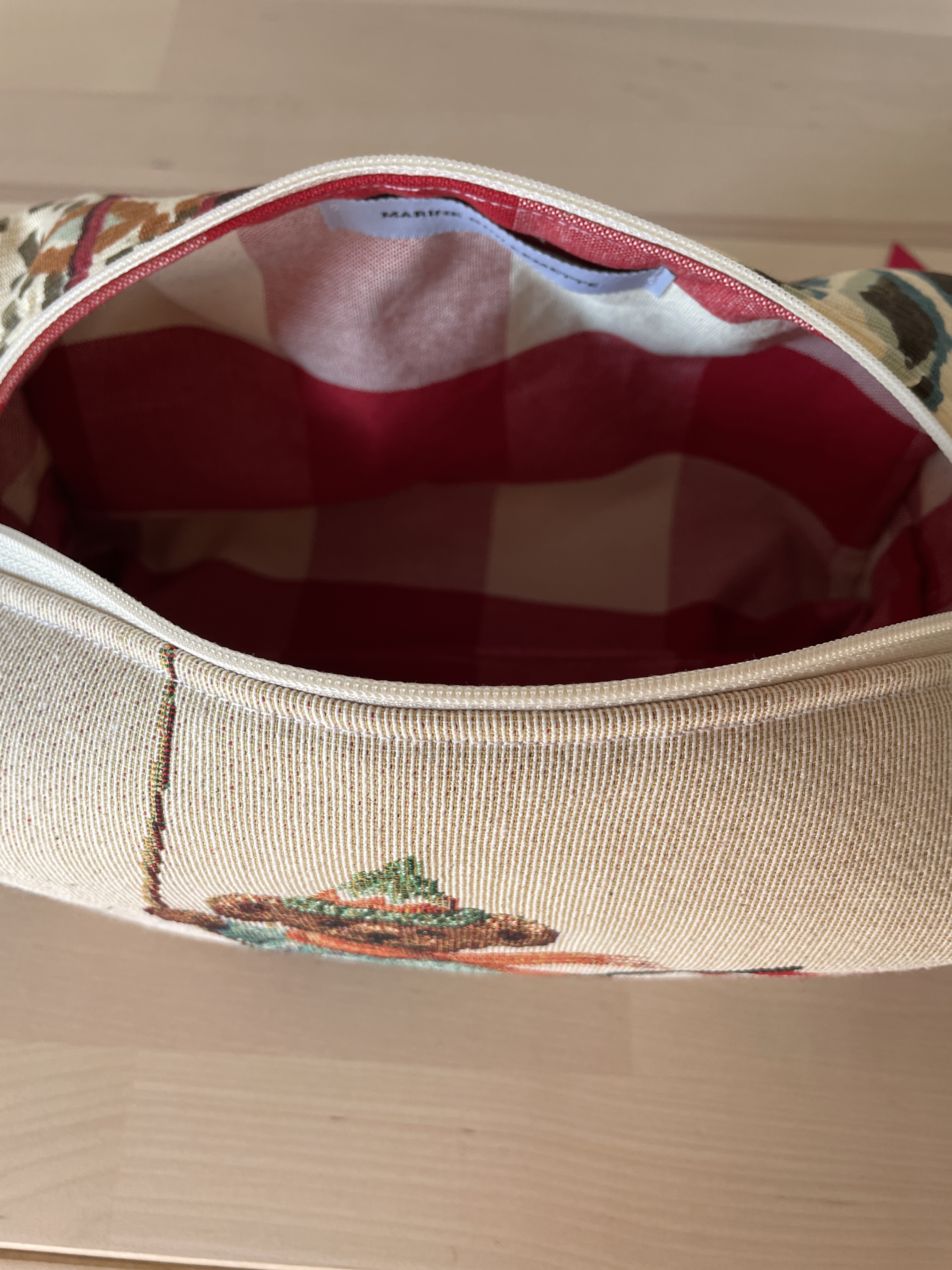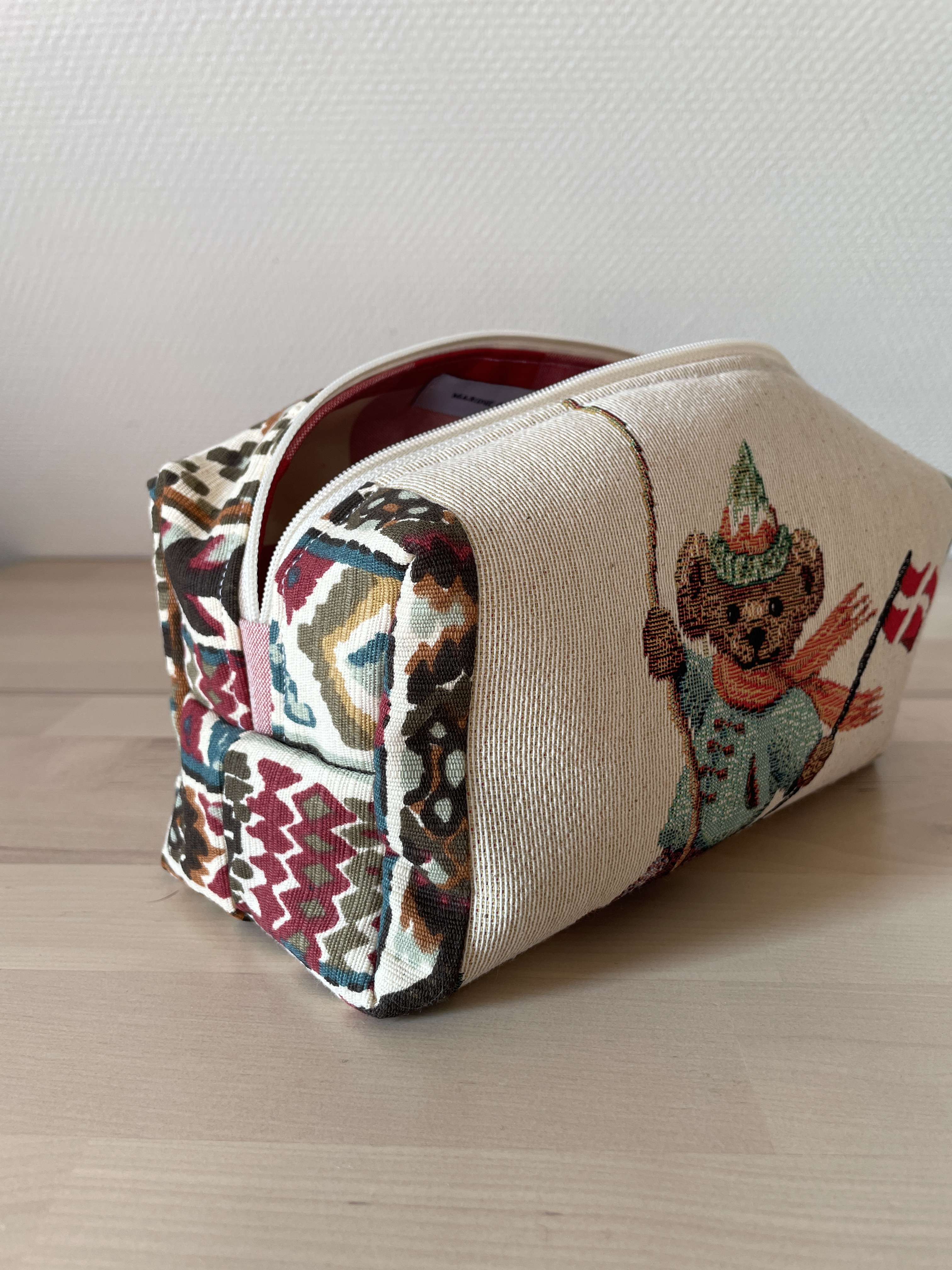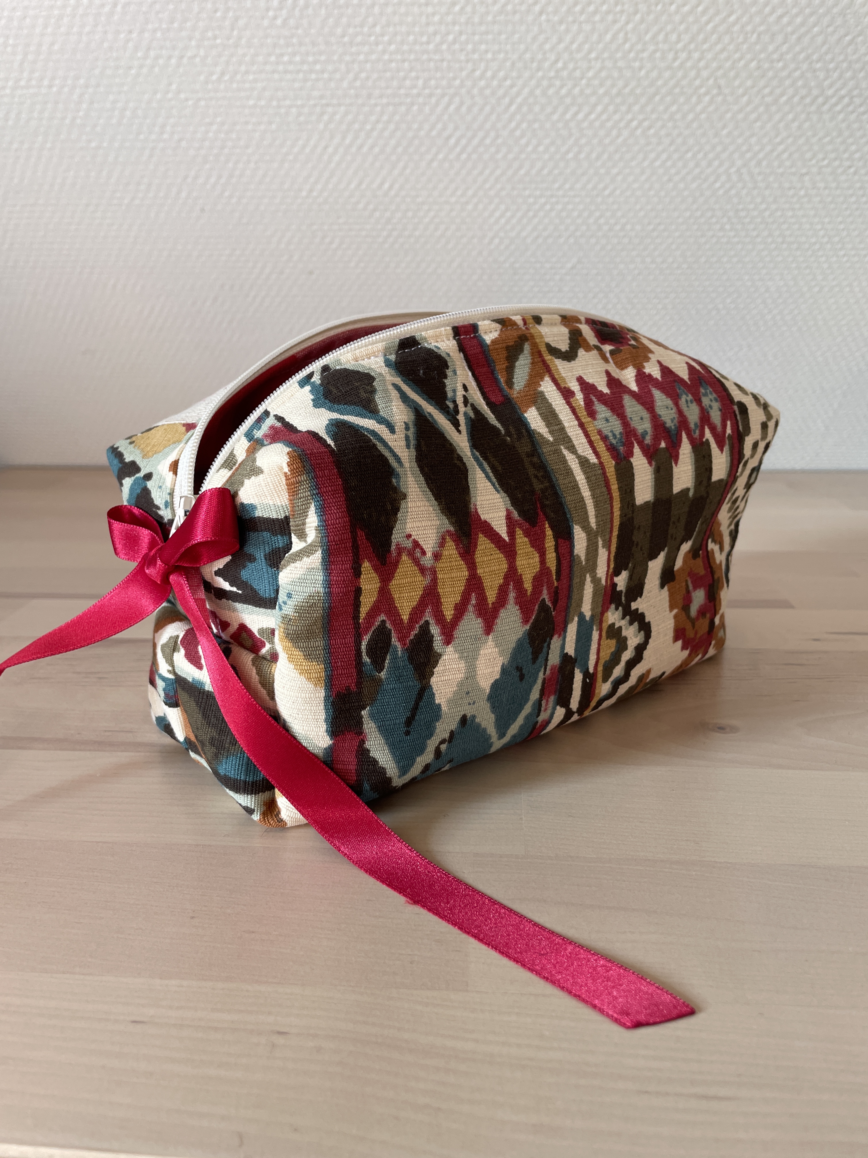 Cette trousse de beauté est confectionnée à l’aide de jacquard vintage au motif ourson et associée à un coton aztèque. Celle-ci est doublée dans une coton à grand carreau rouge. Cette trousse est unique et possède un ruban satiné rouge sur la bout de la fermeture.