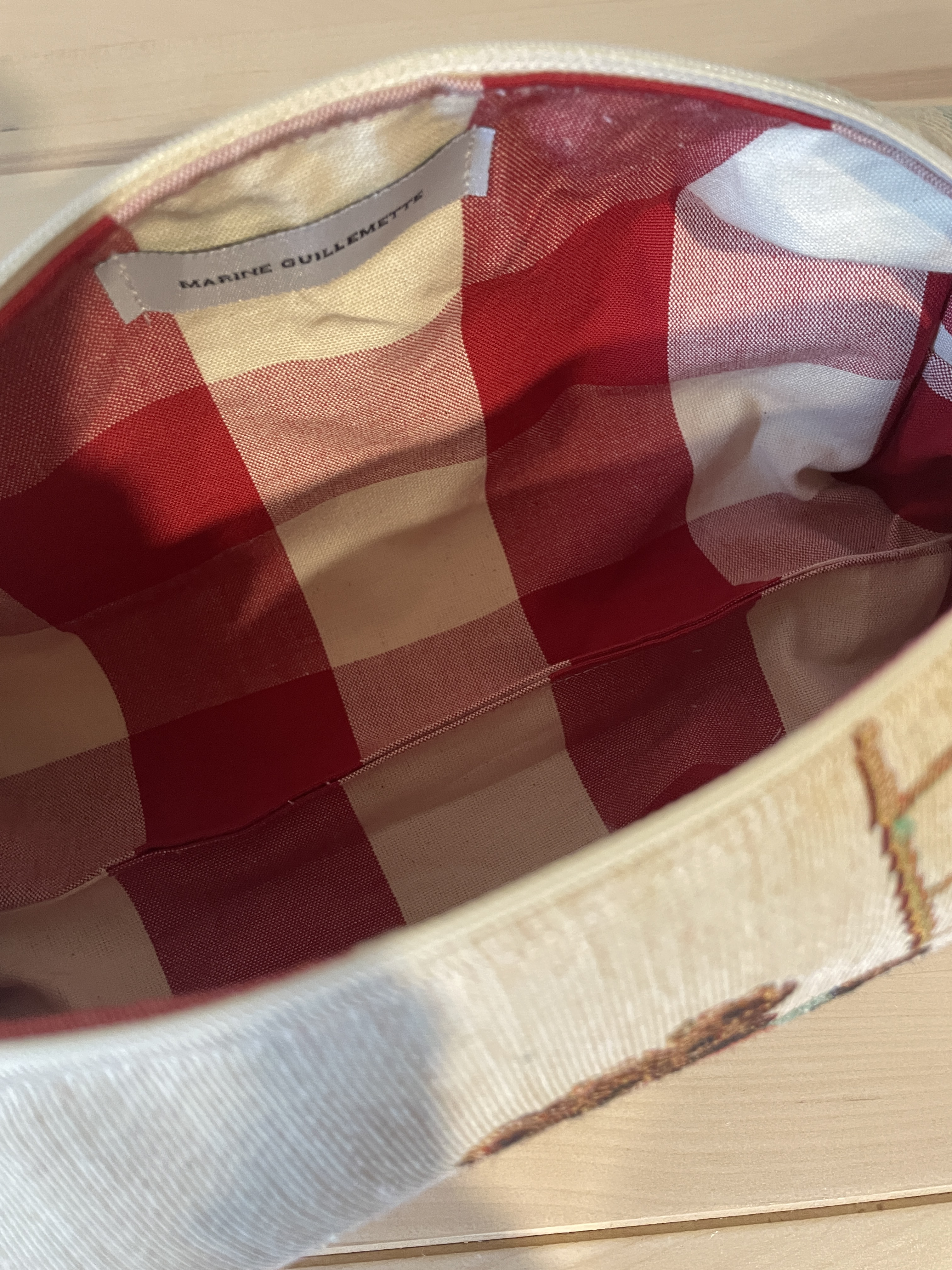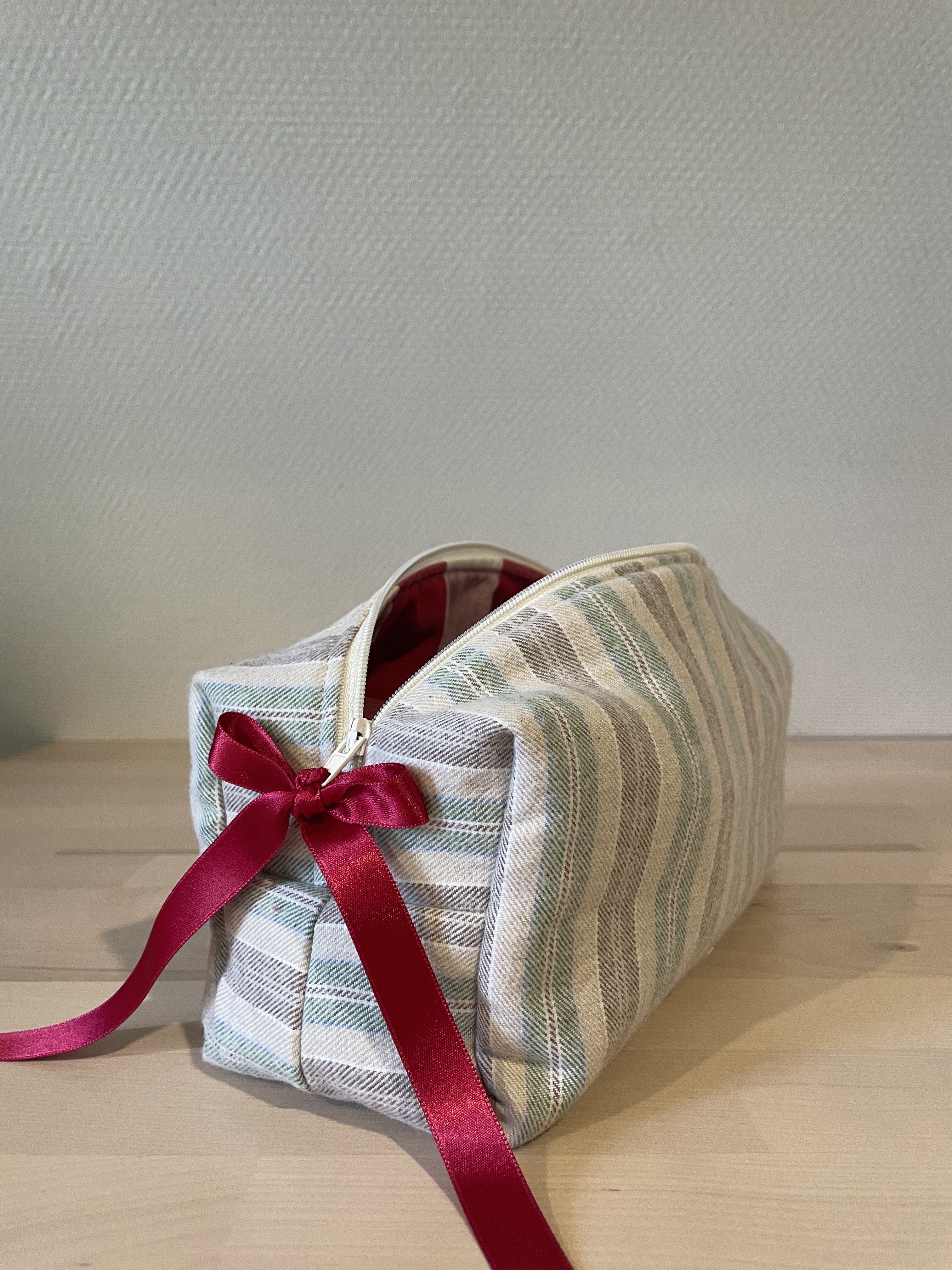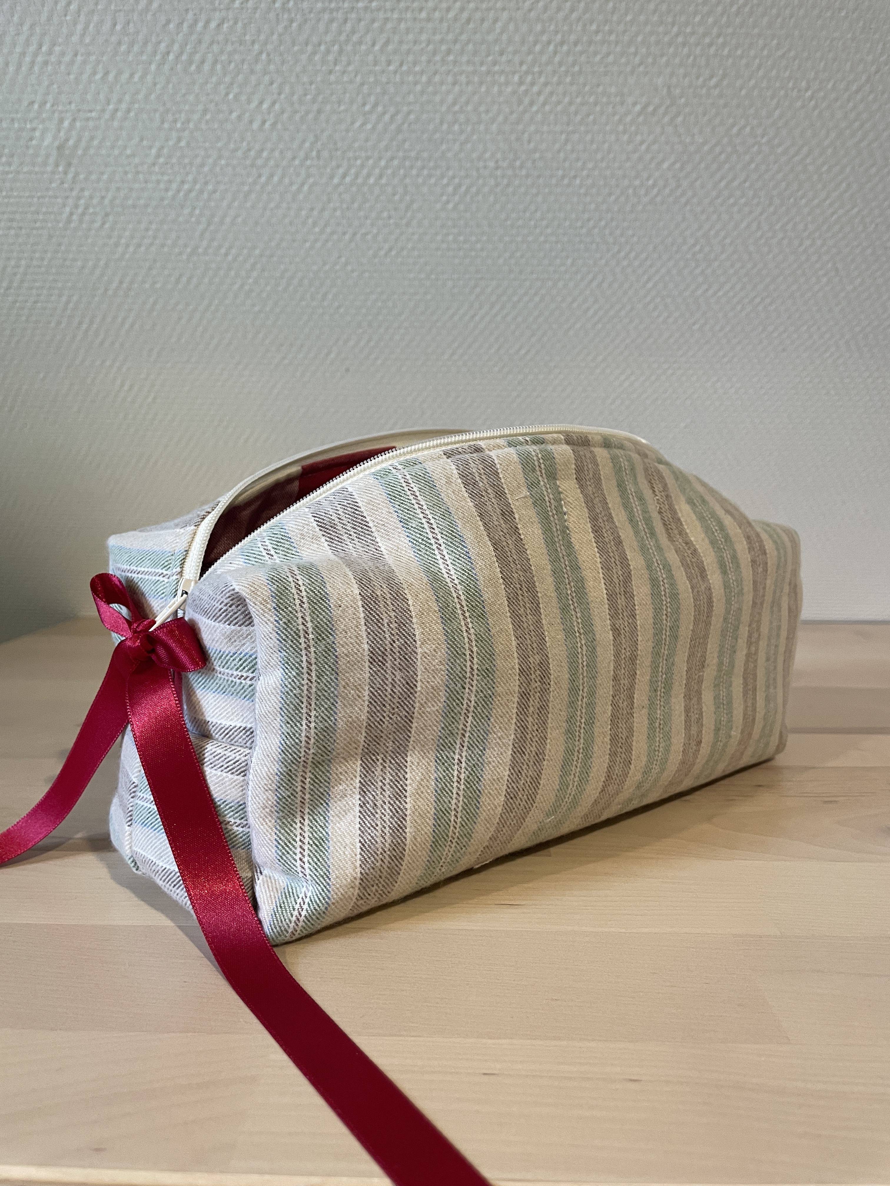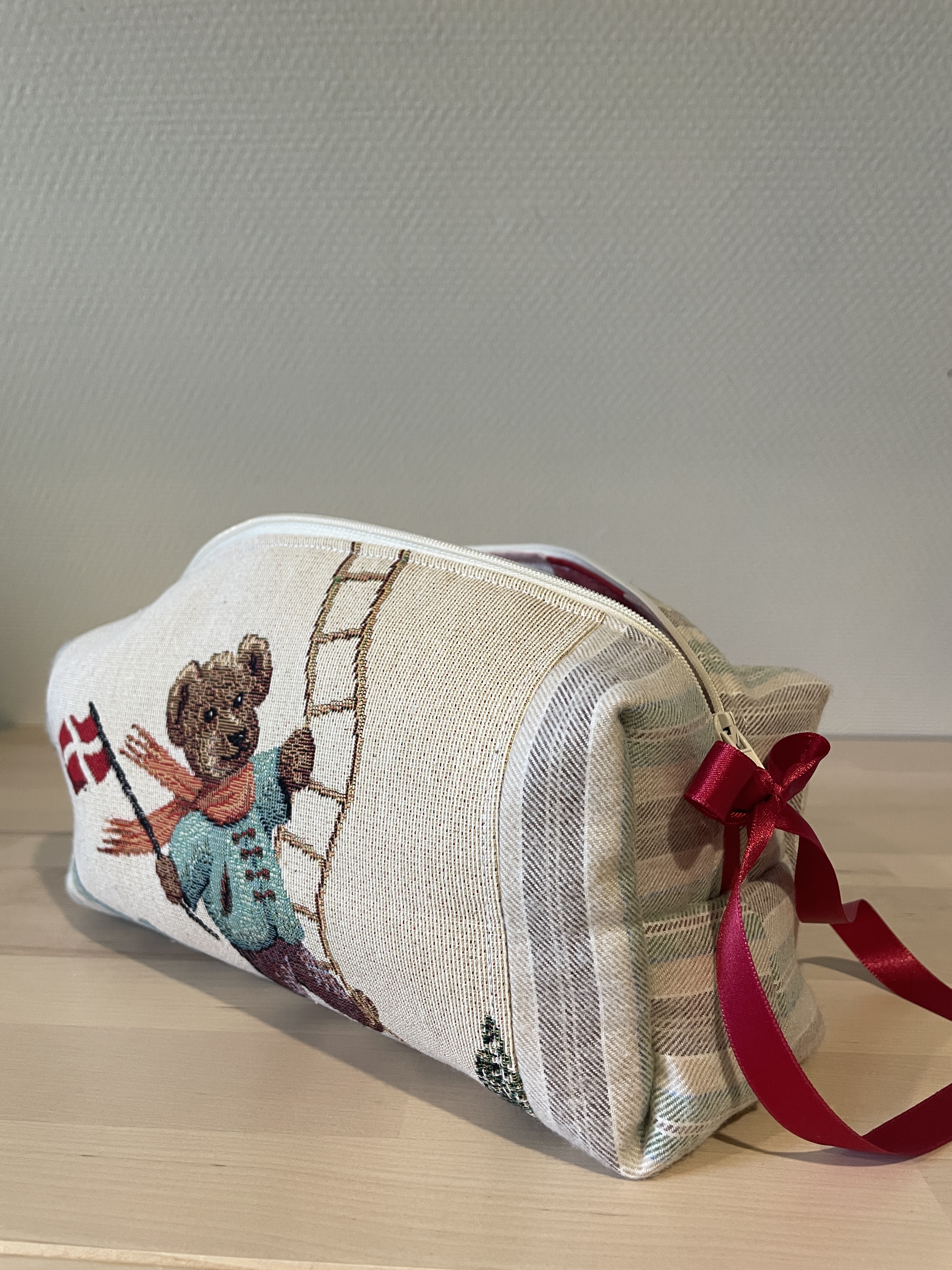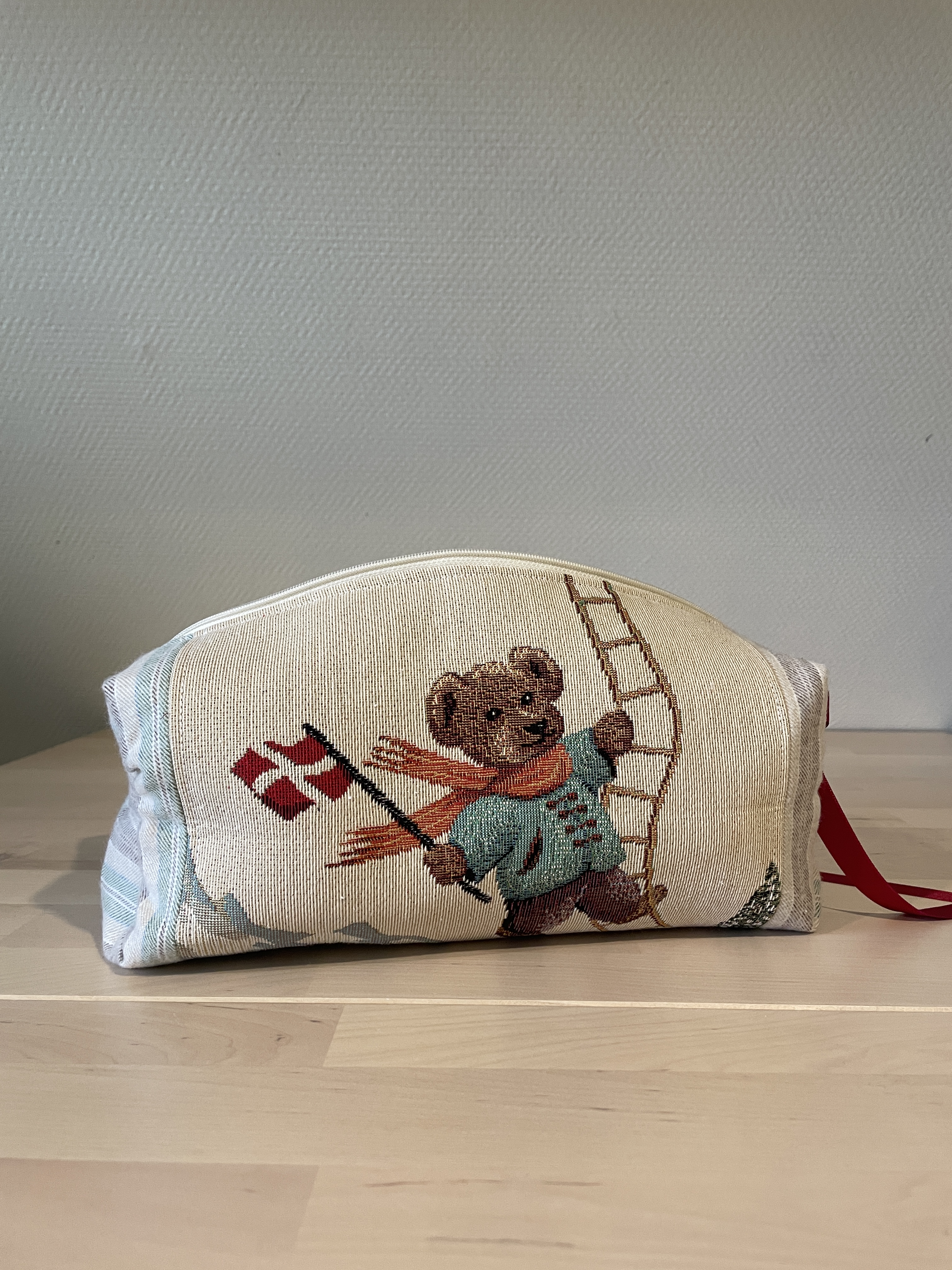 Cette trousse de beauté est confectionnée à l’aide de jacquard vintage au motif ourson et associée à un coton duveteux à rayures. Celle-ci est doublée dans une coton à grand carreau rouge. Cette trousse est unique et possède un ruban satiné rouge sur la bout de la fermeture.