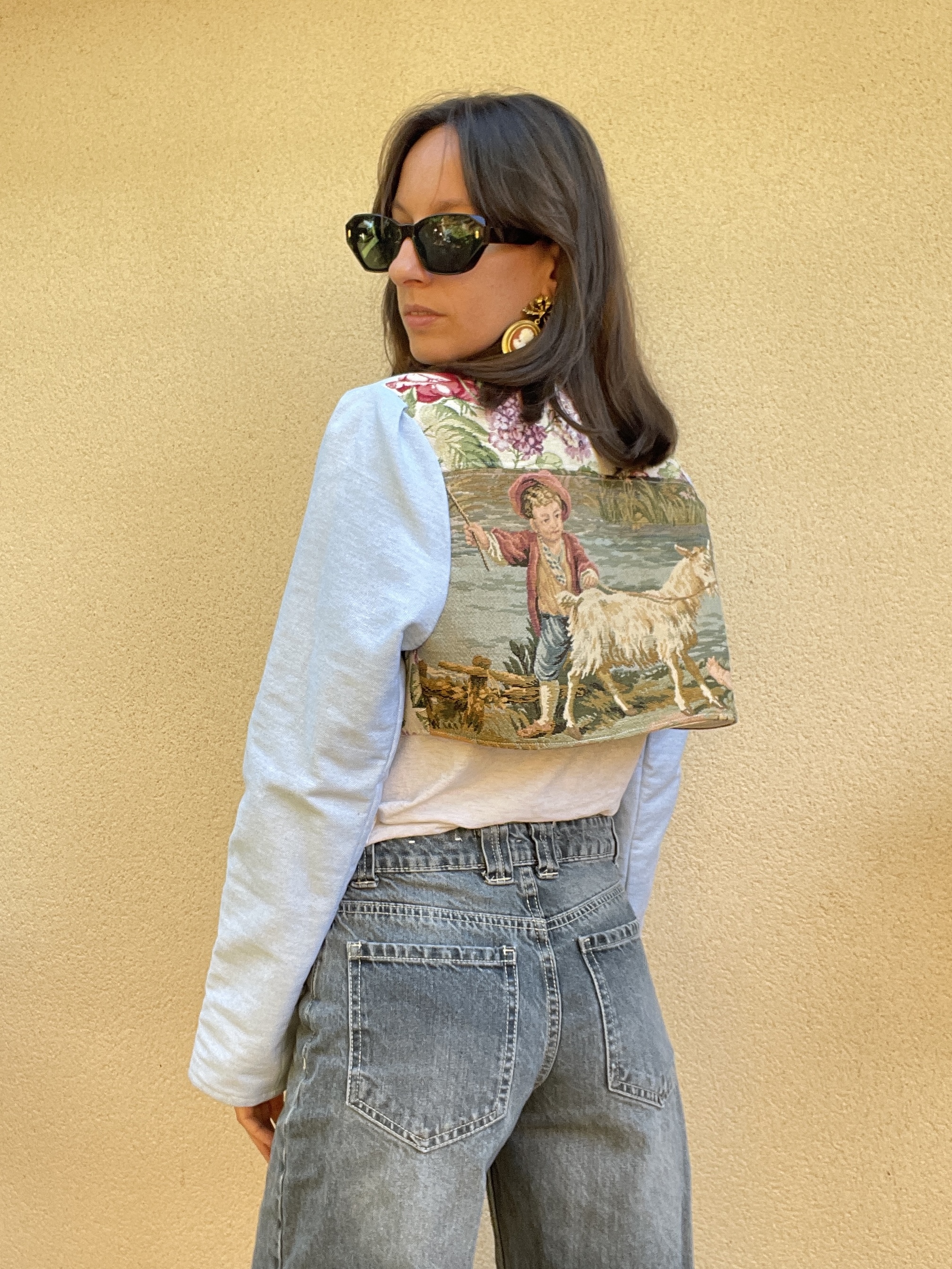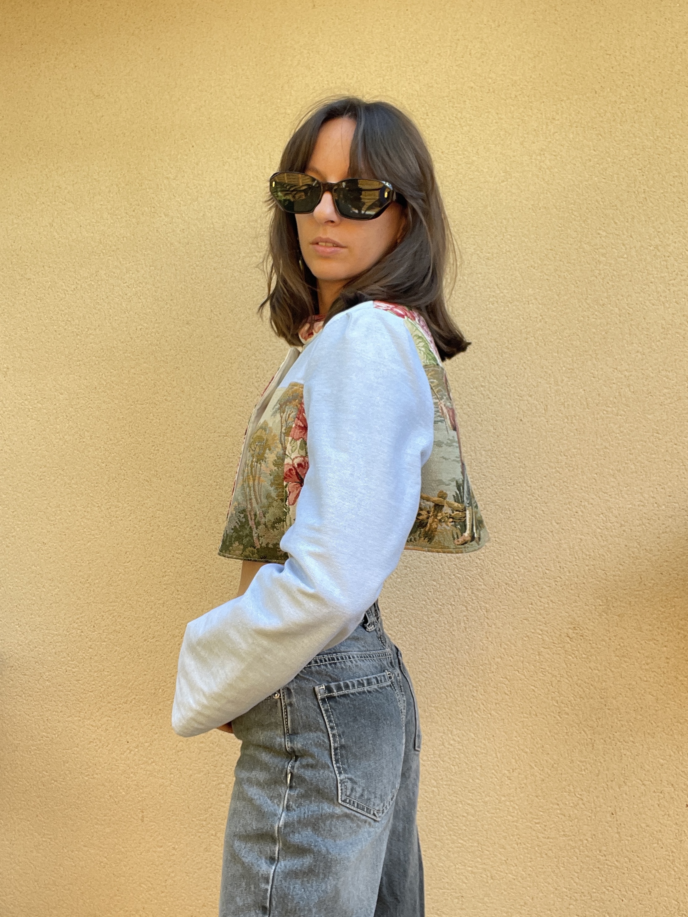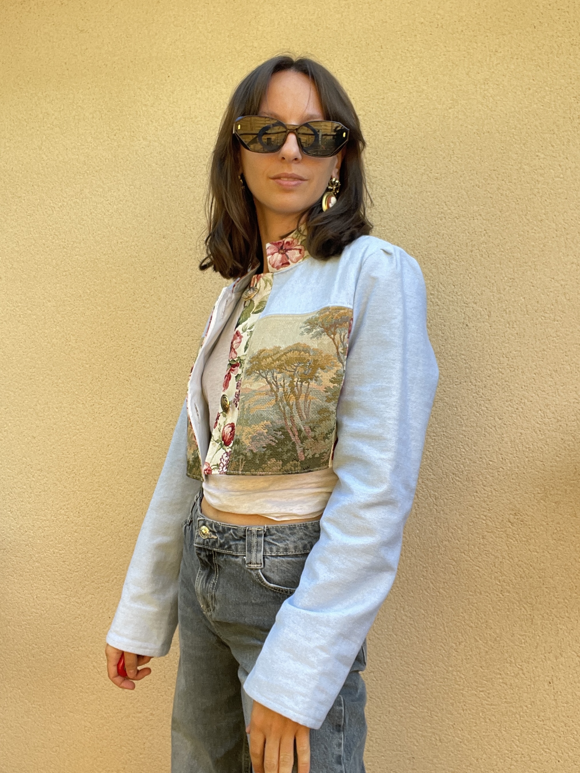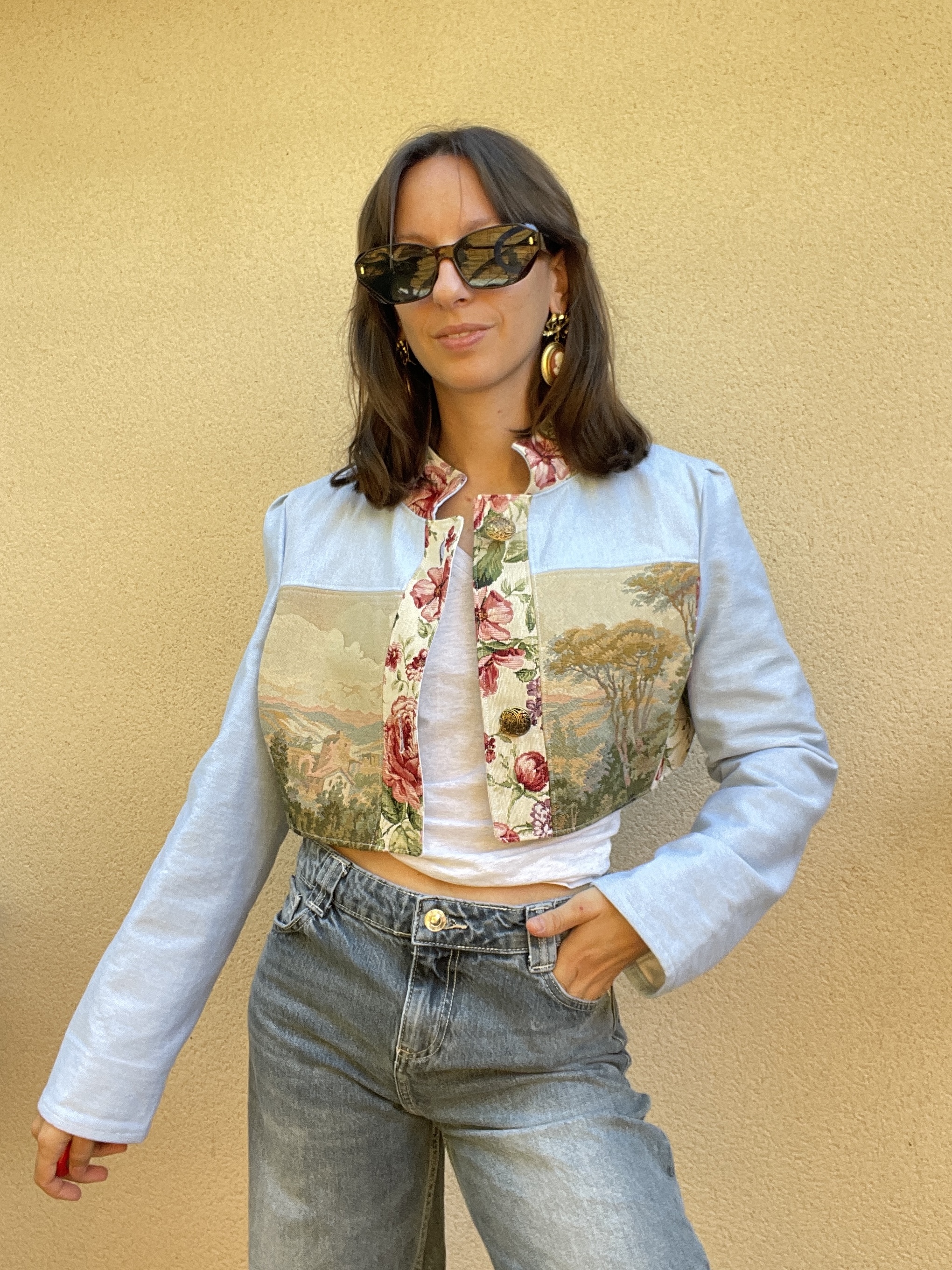 Patchwork de jacquard à fleurs et de jean bleu ciel