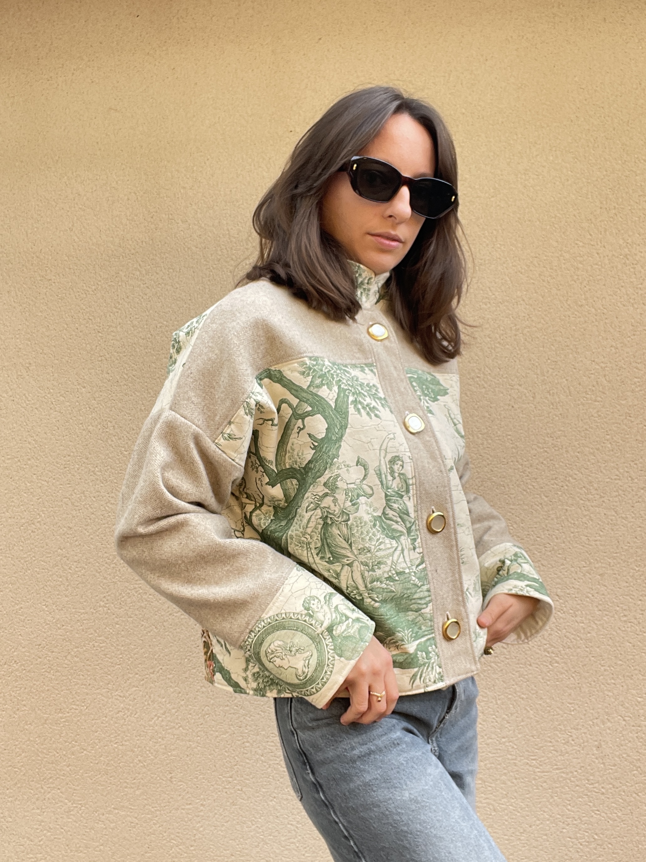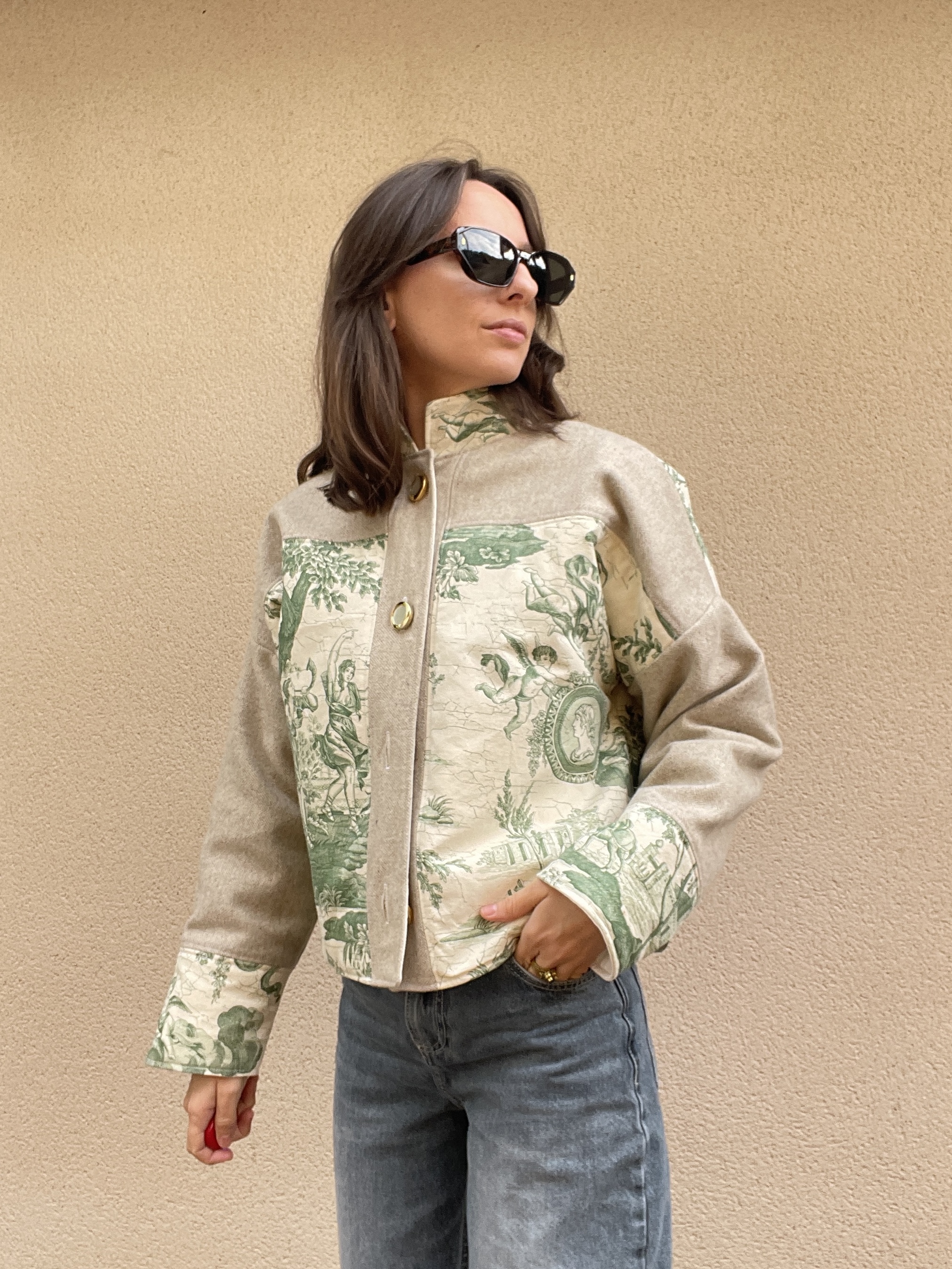 Patchwork de toile de jouy verte matelassée et de lainage beige