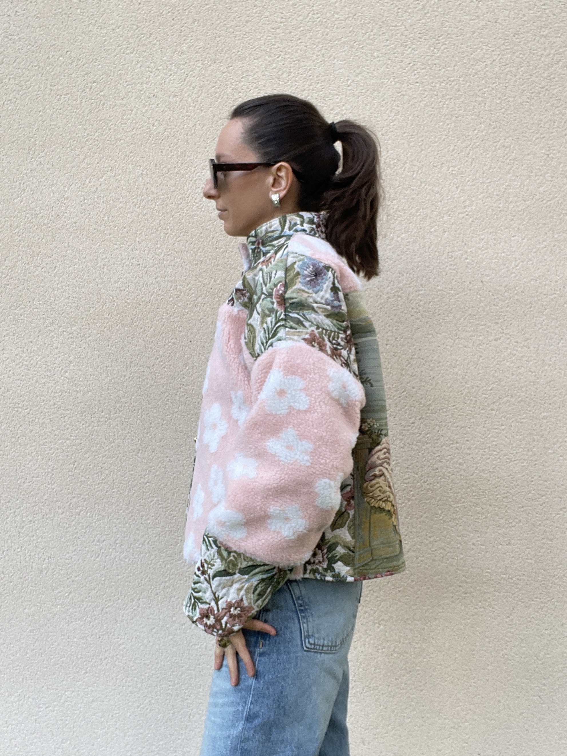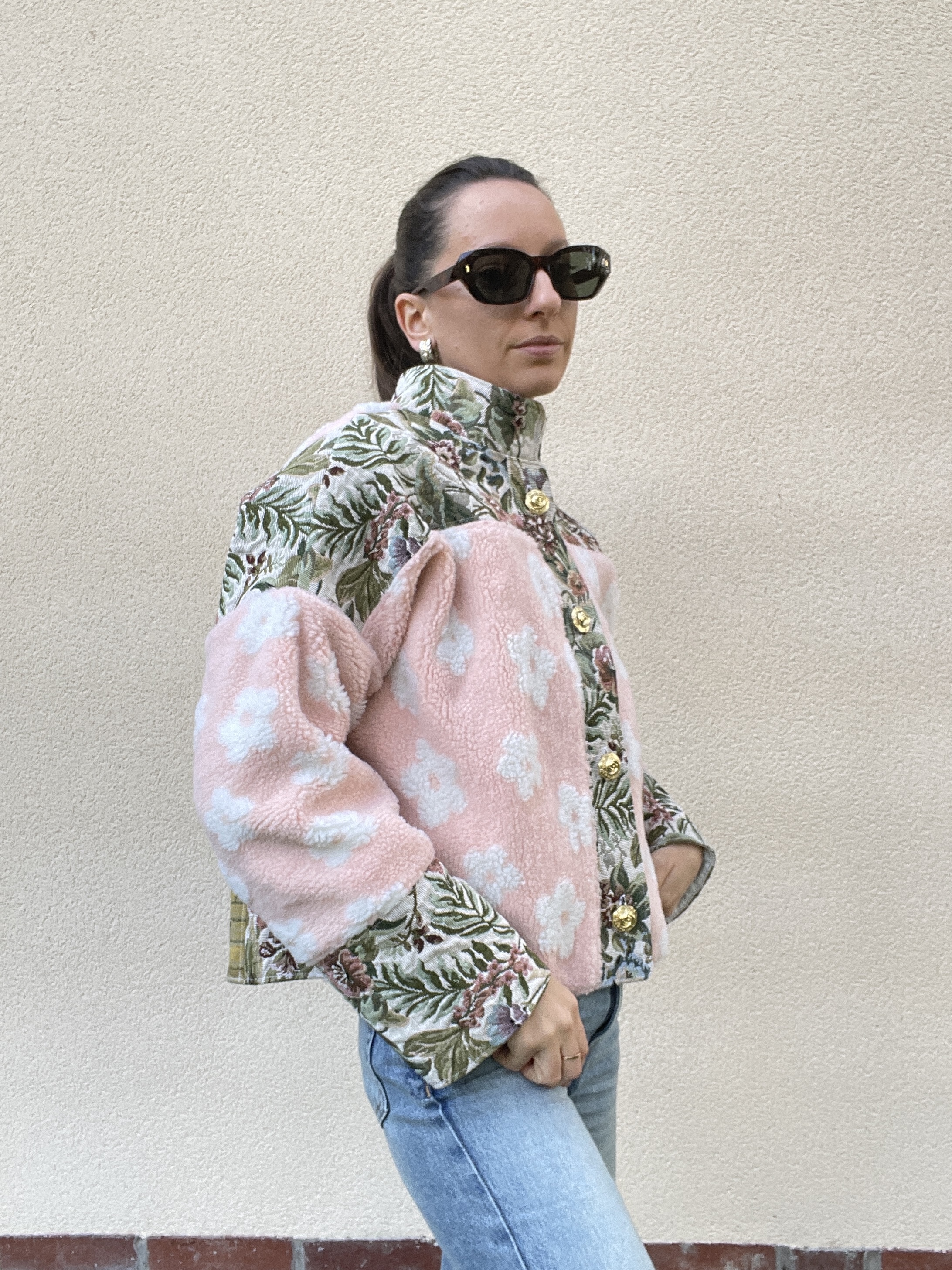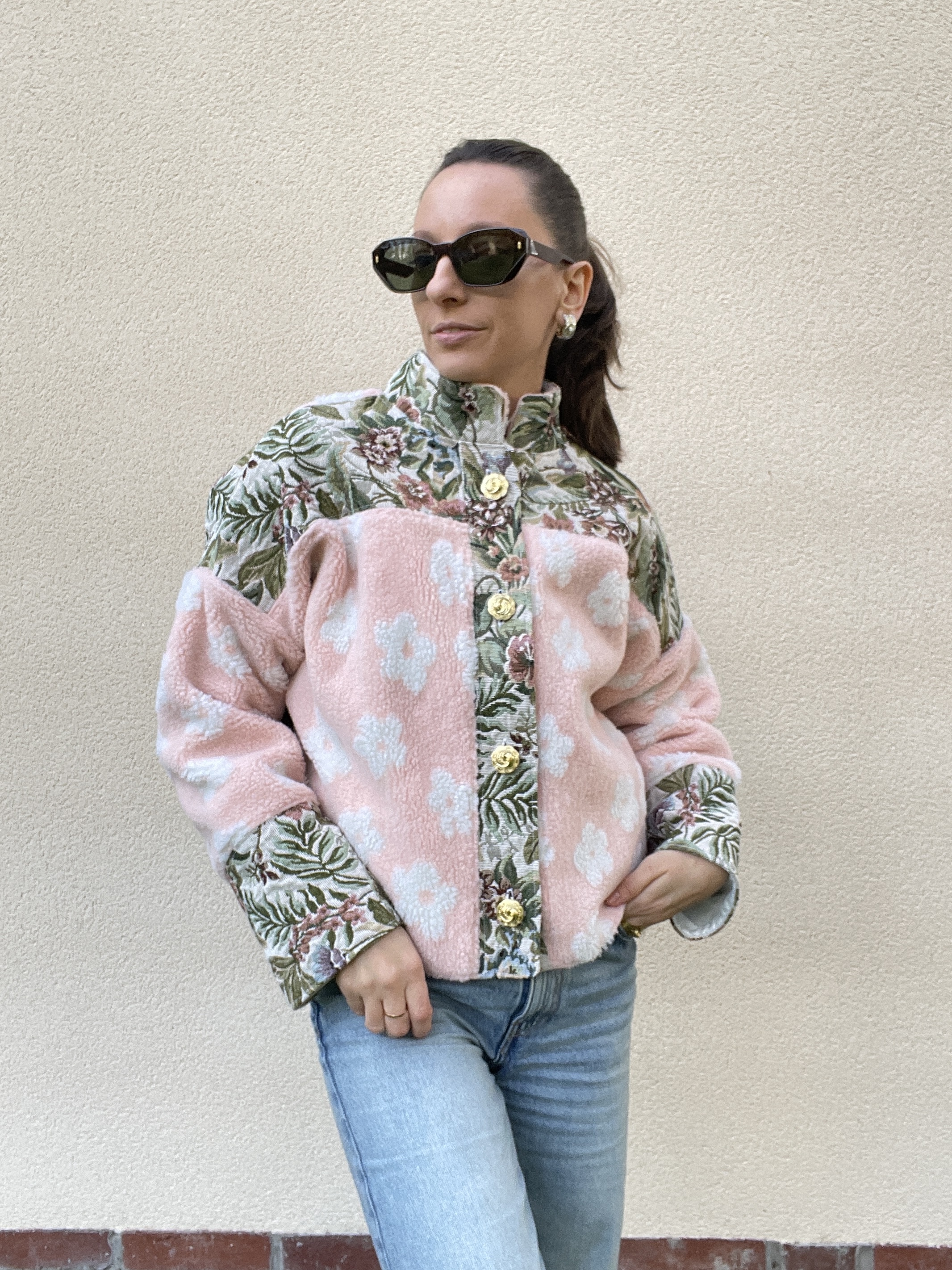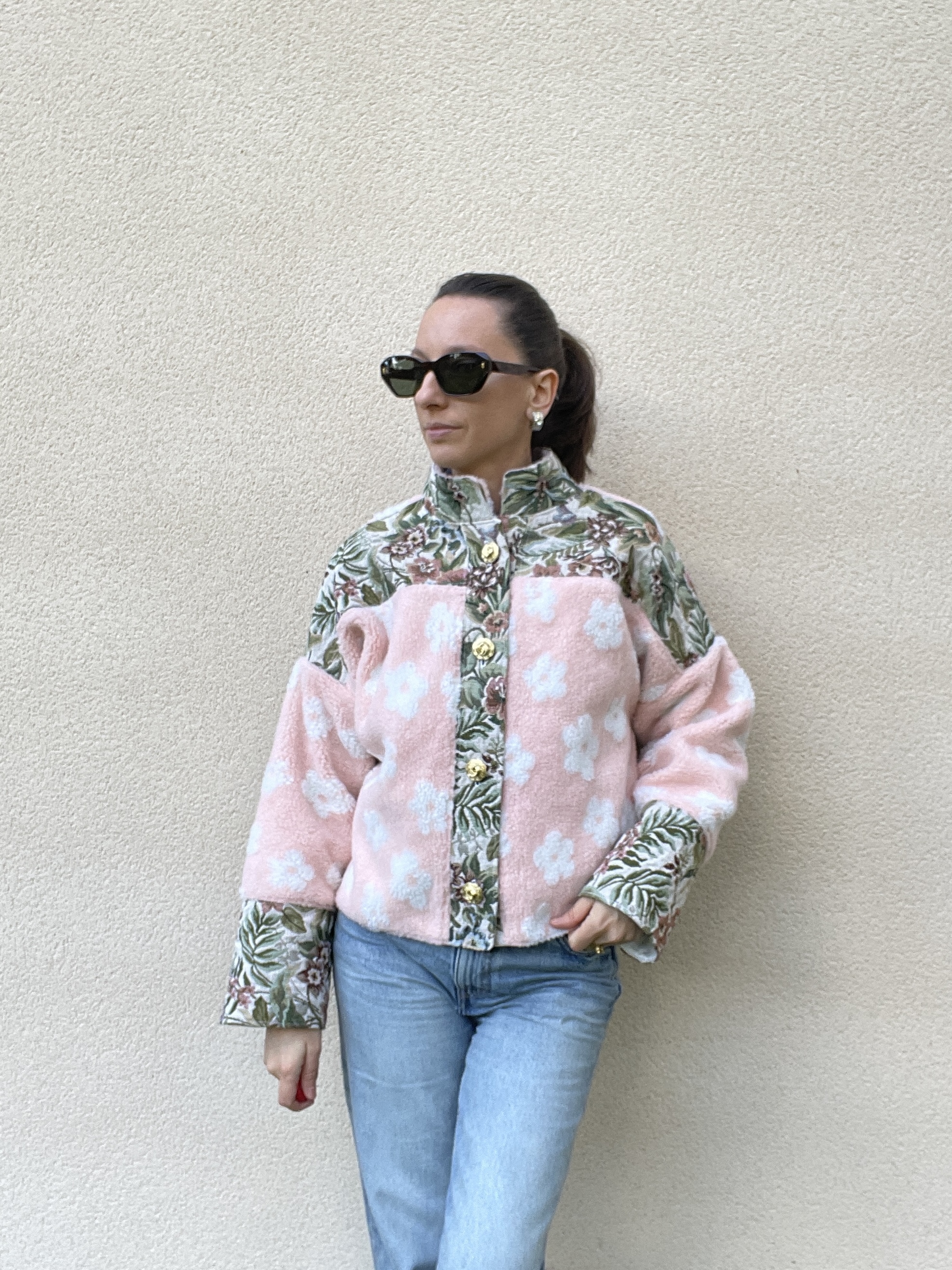 Patchwork de tissu sherpa rose pâle et de jacquard à fleurs