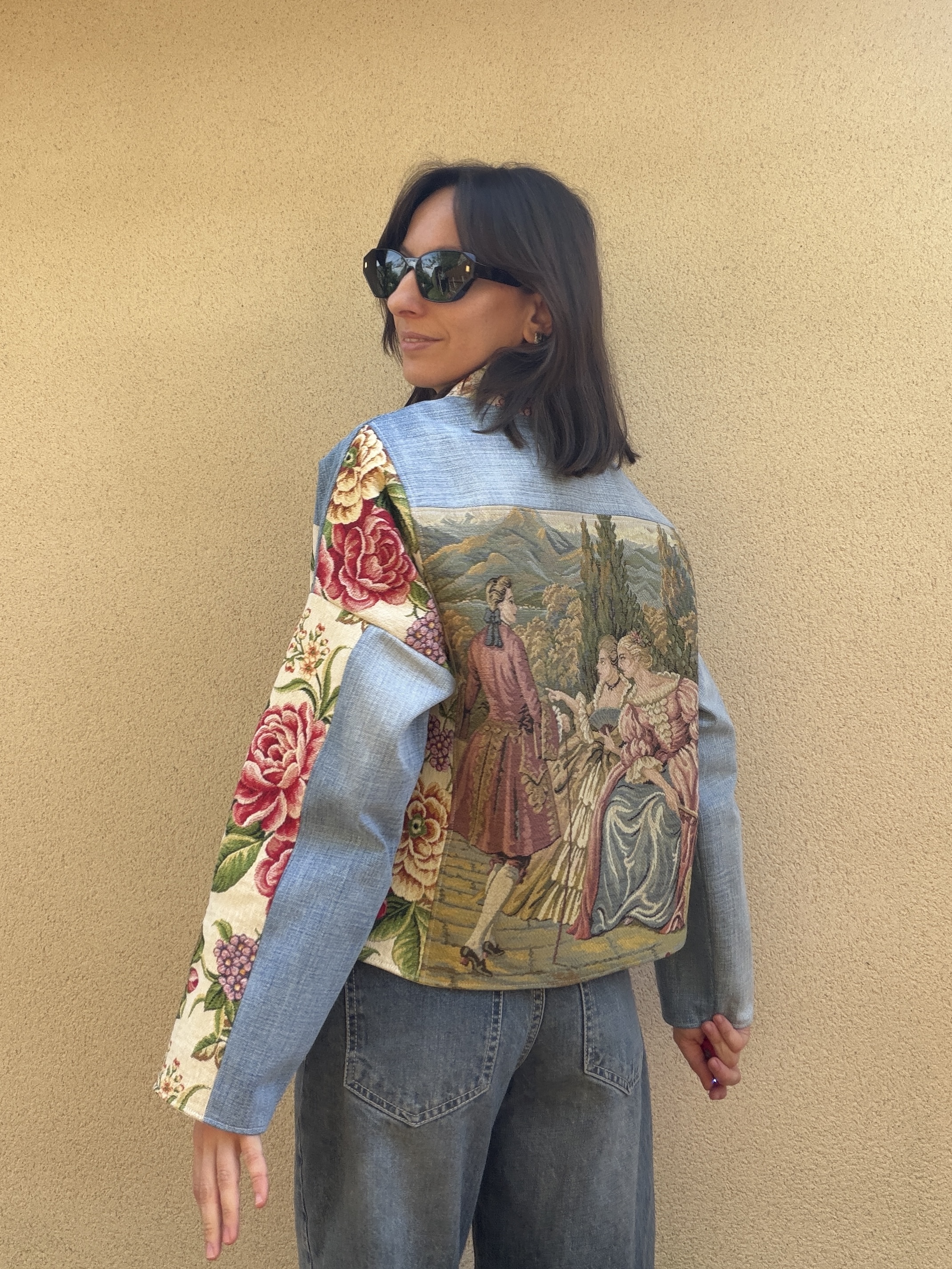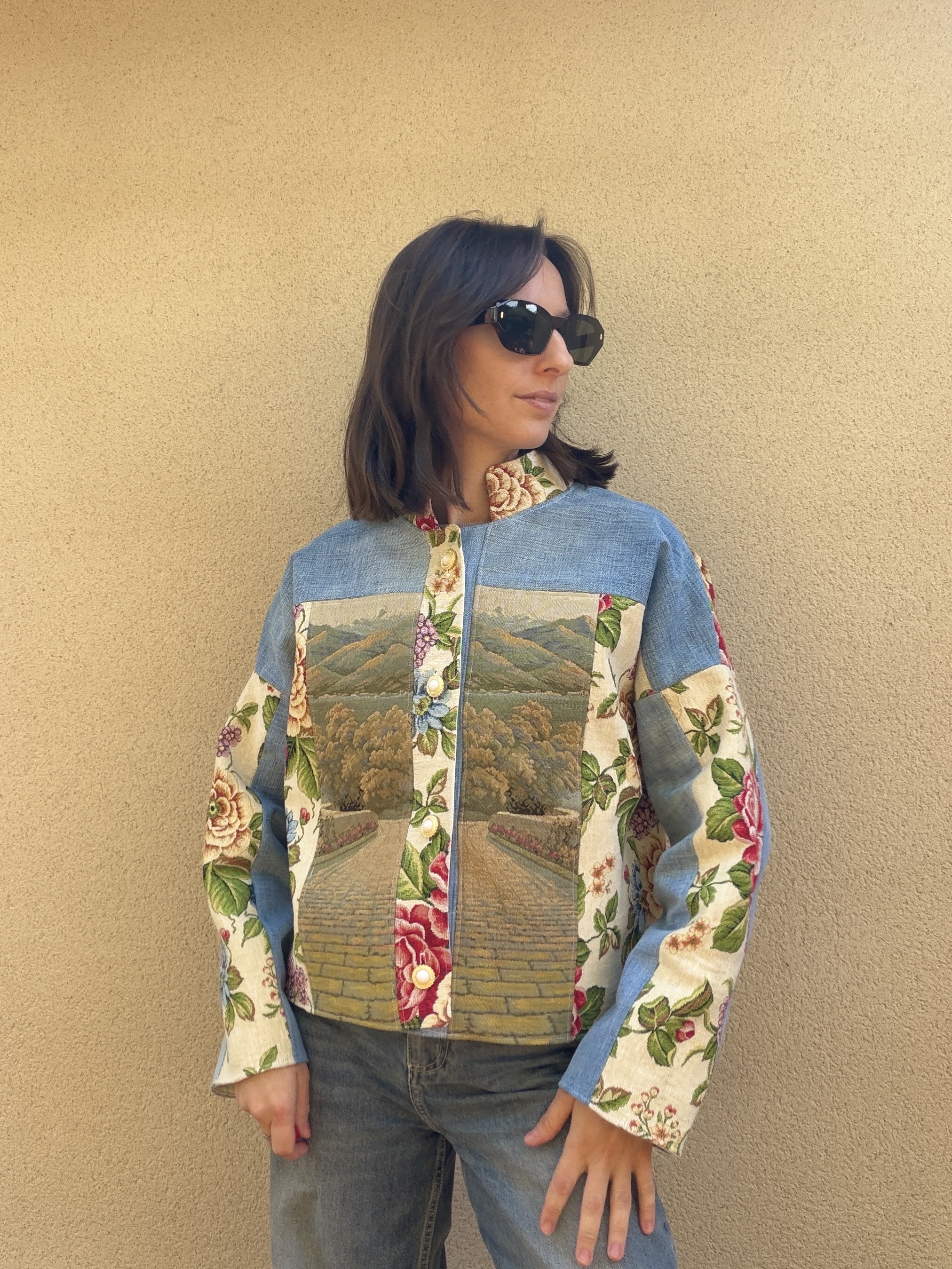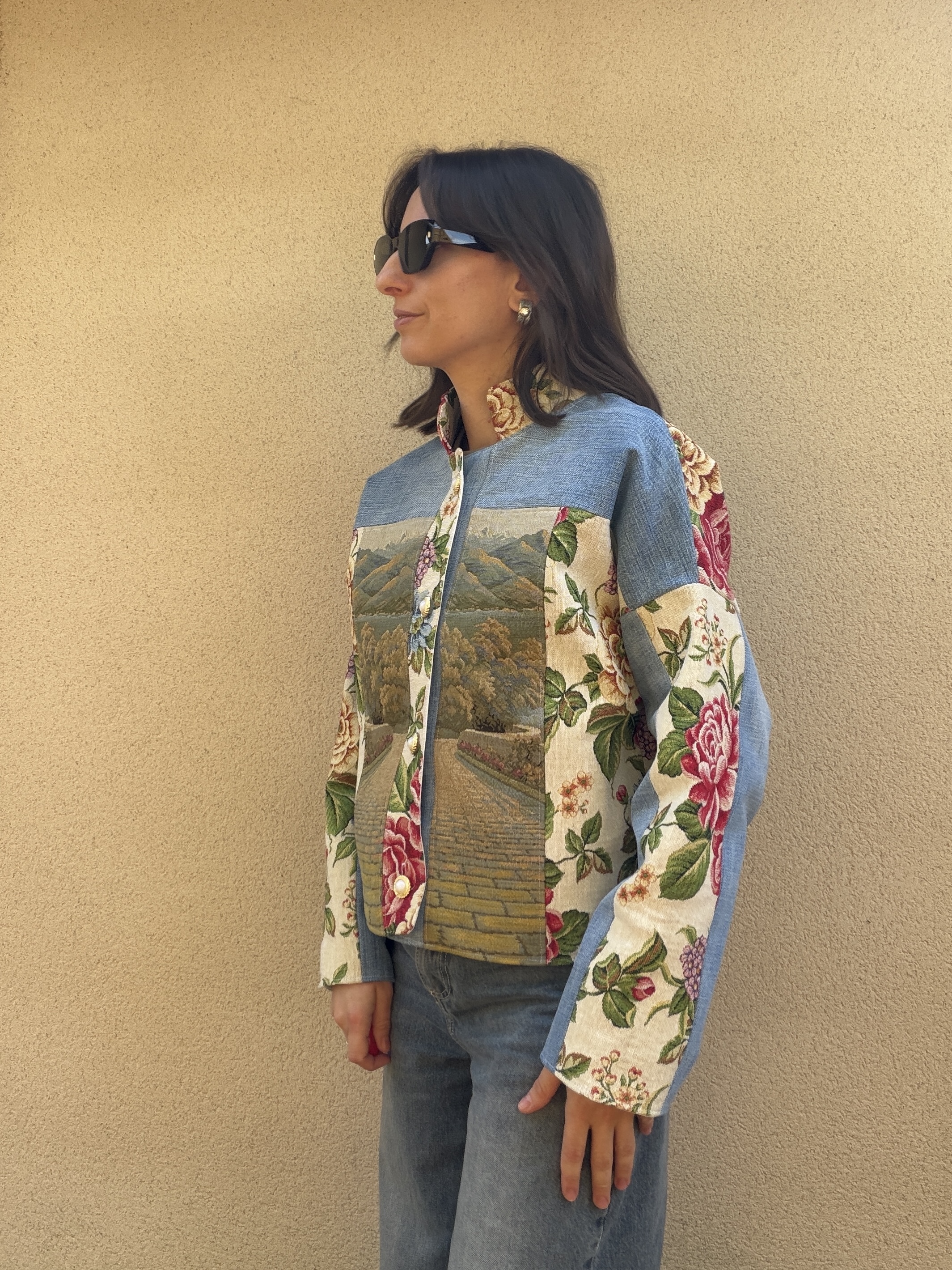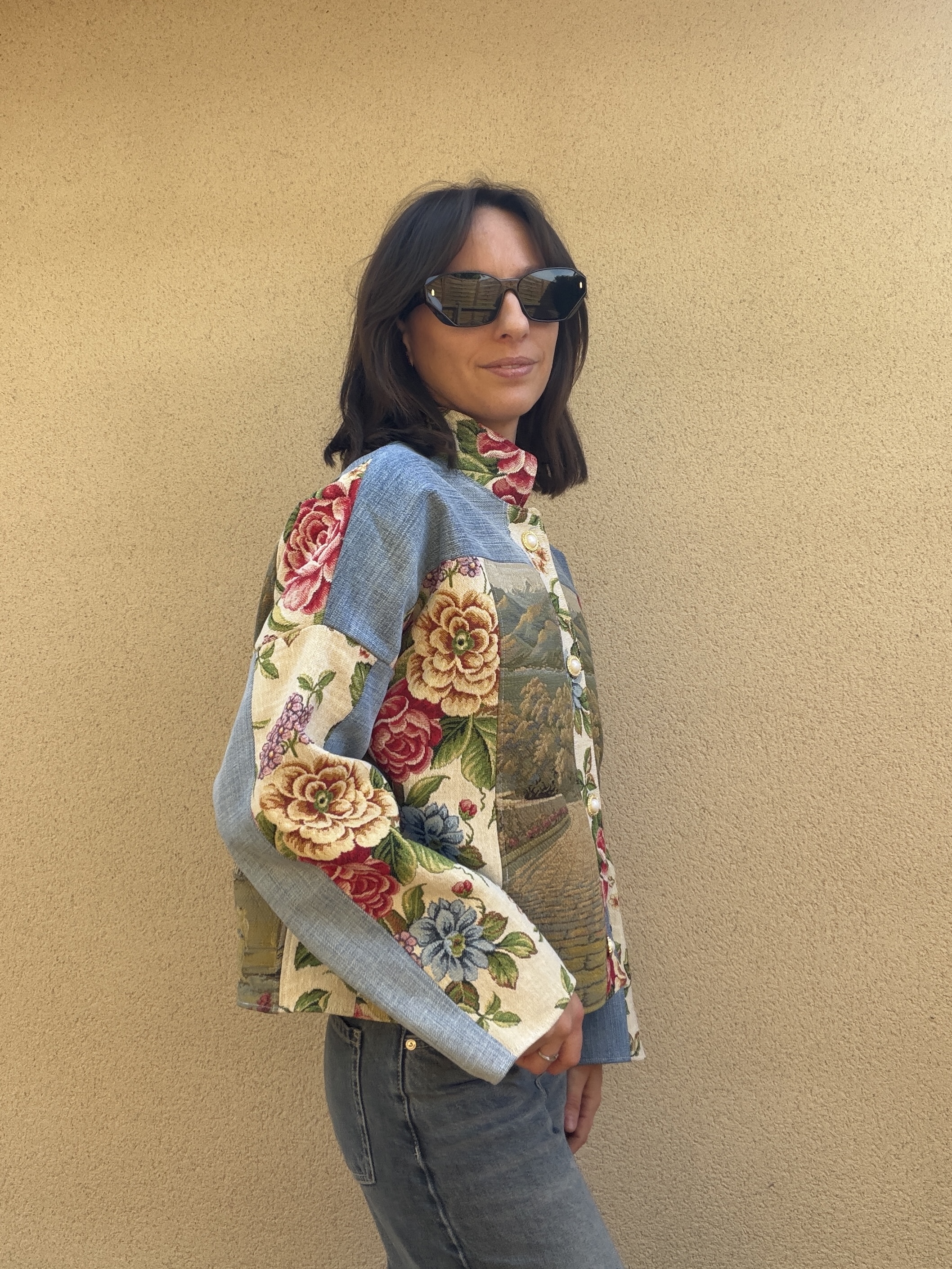 Patchwork de jean bleu ciel et de jacquard à fleurs