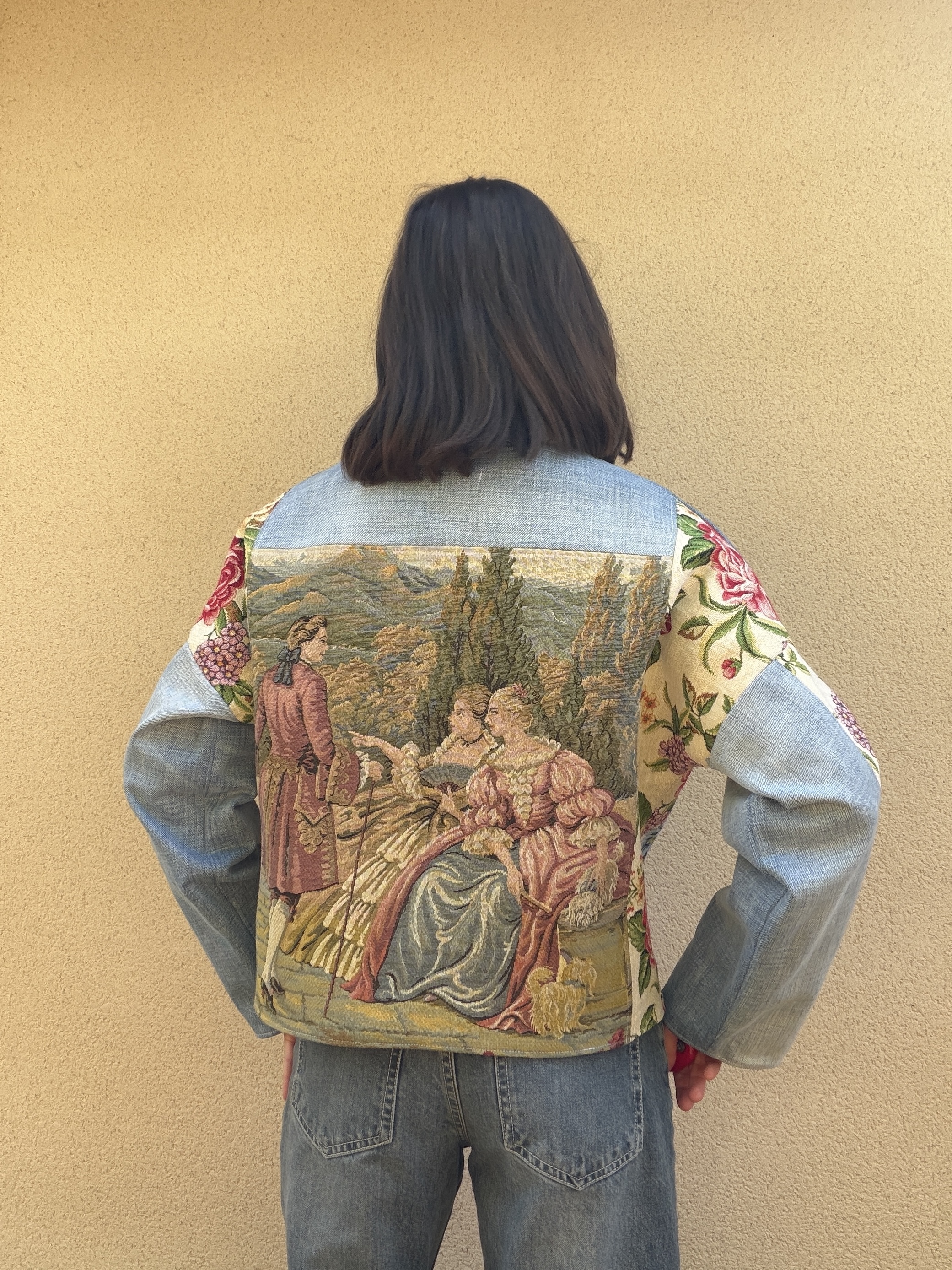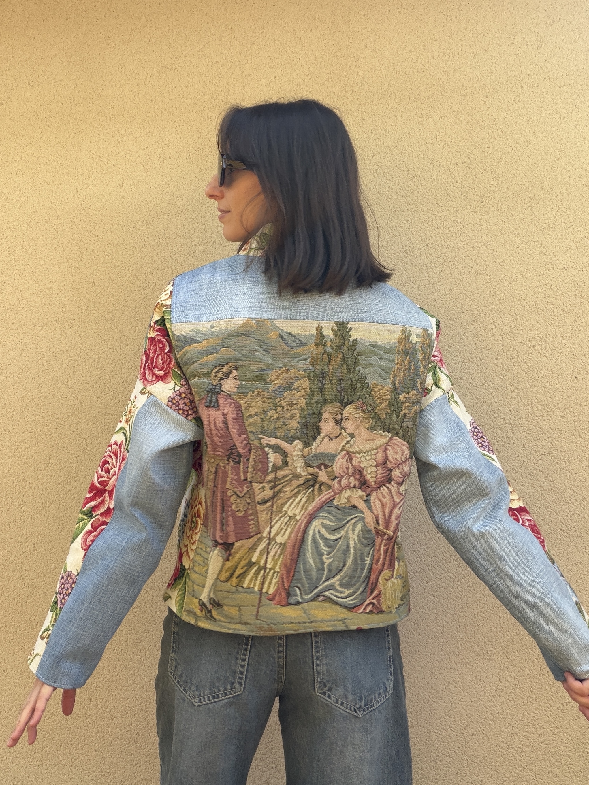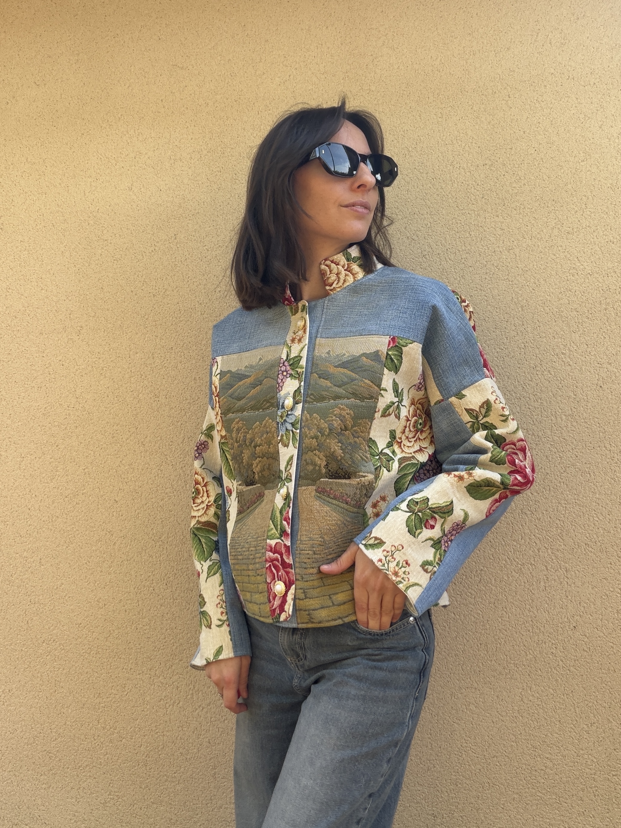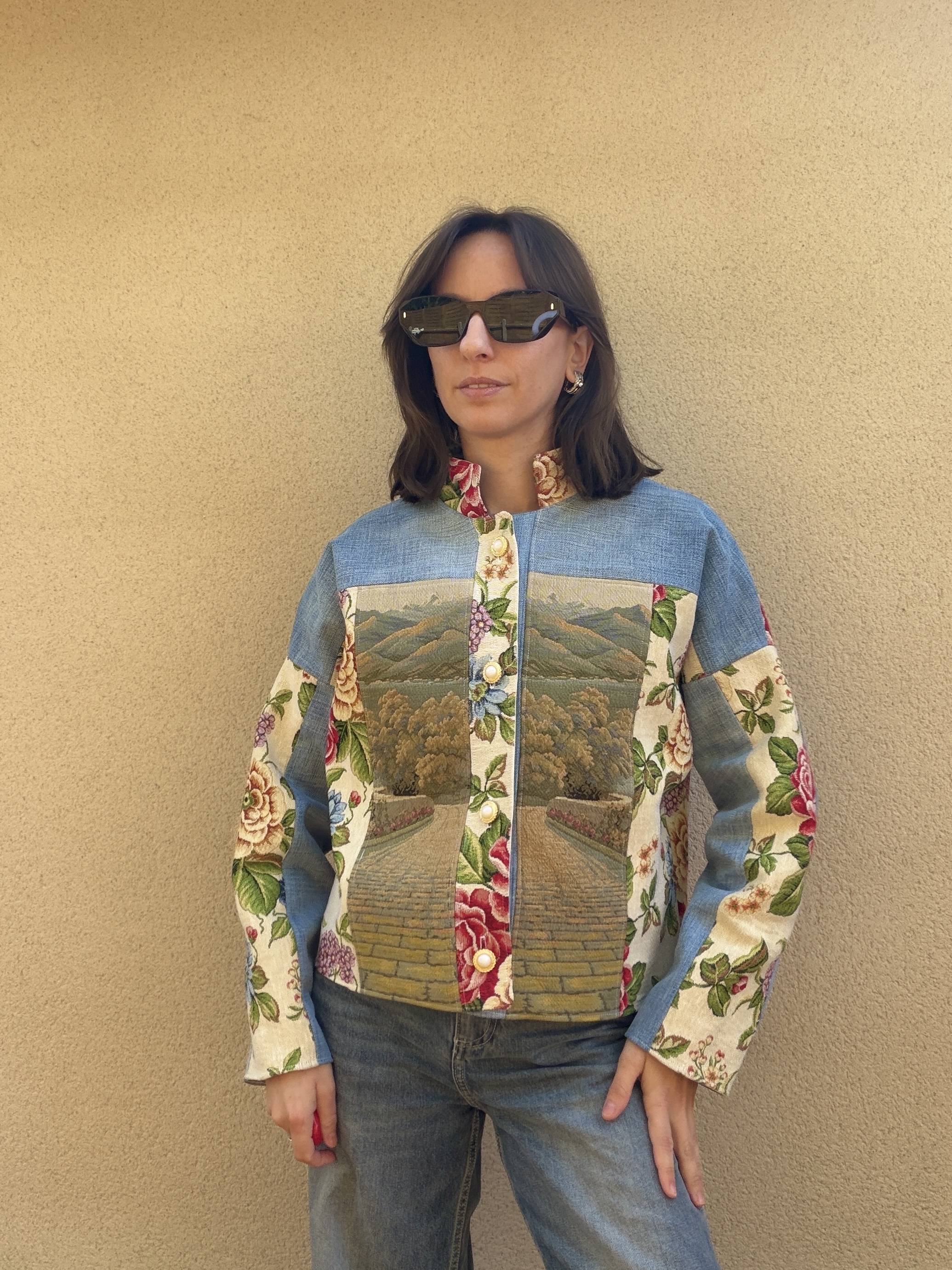 Patchwork de jean bleu ciel et de jacquard à fleurs