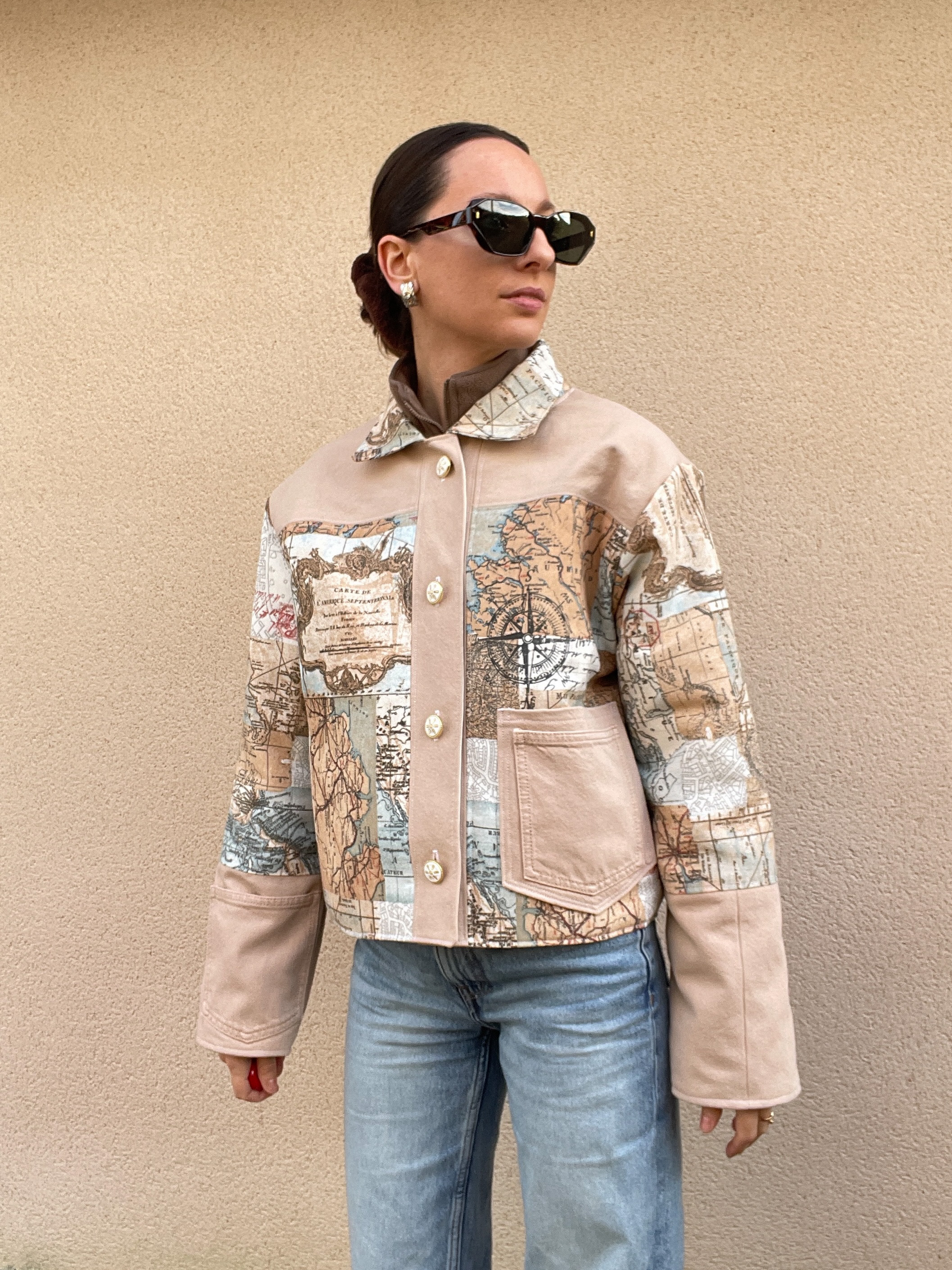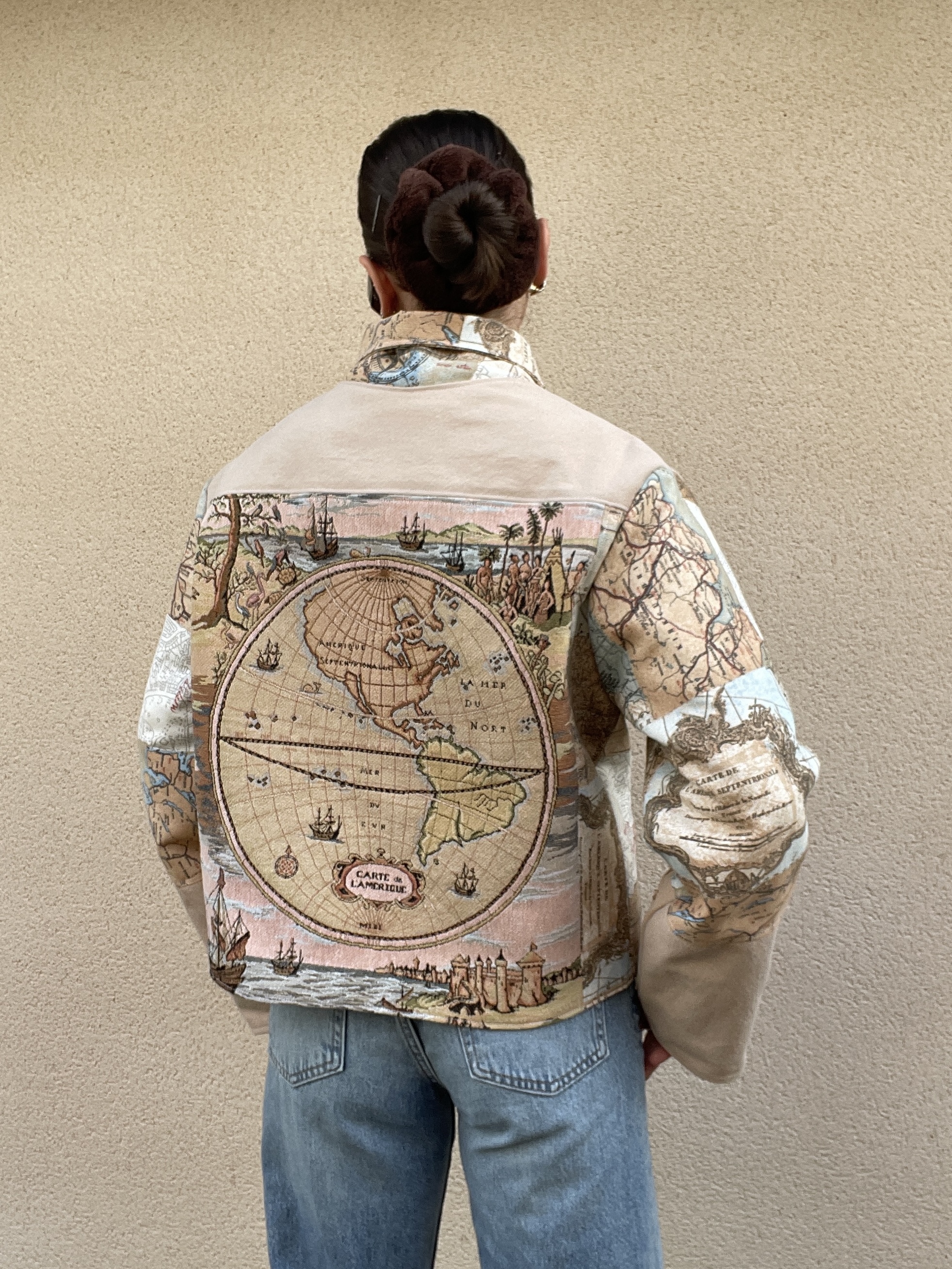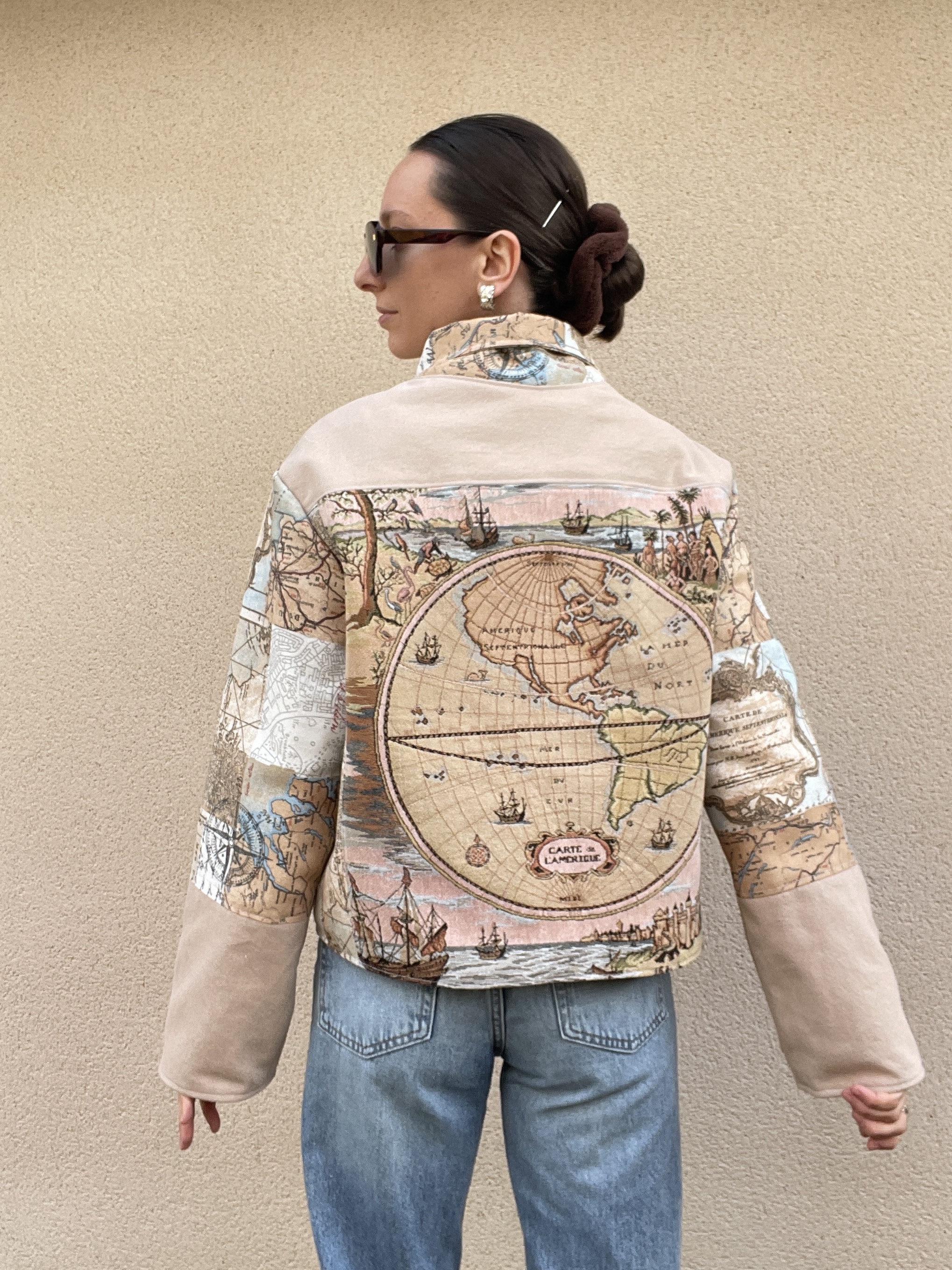 Patchwork de jean et de toile de coton à l’imprimé carte du monde