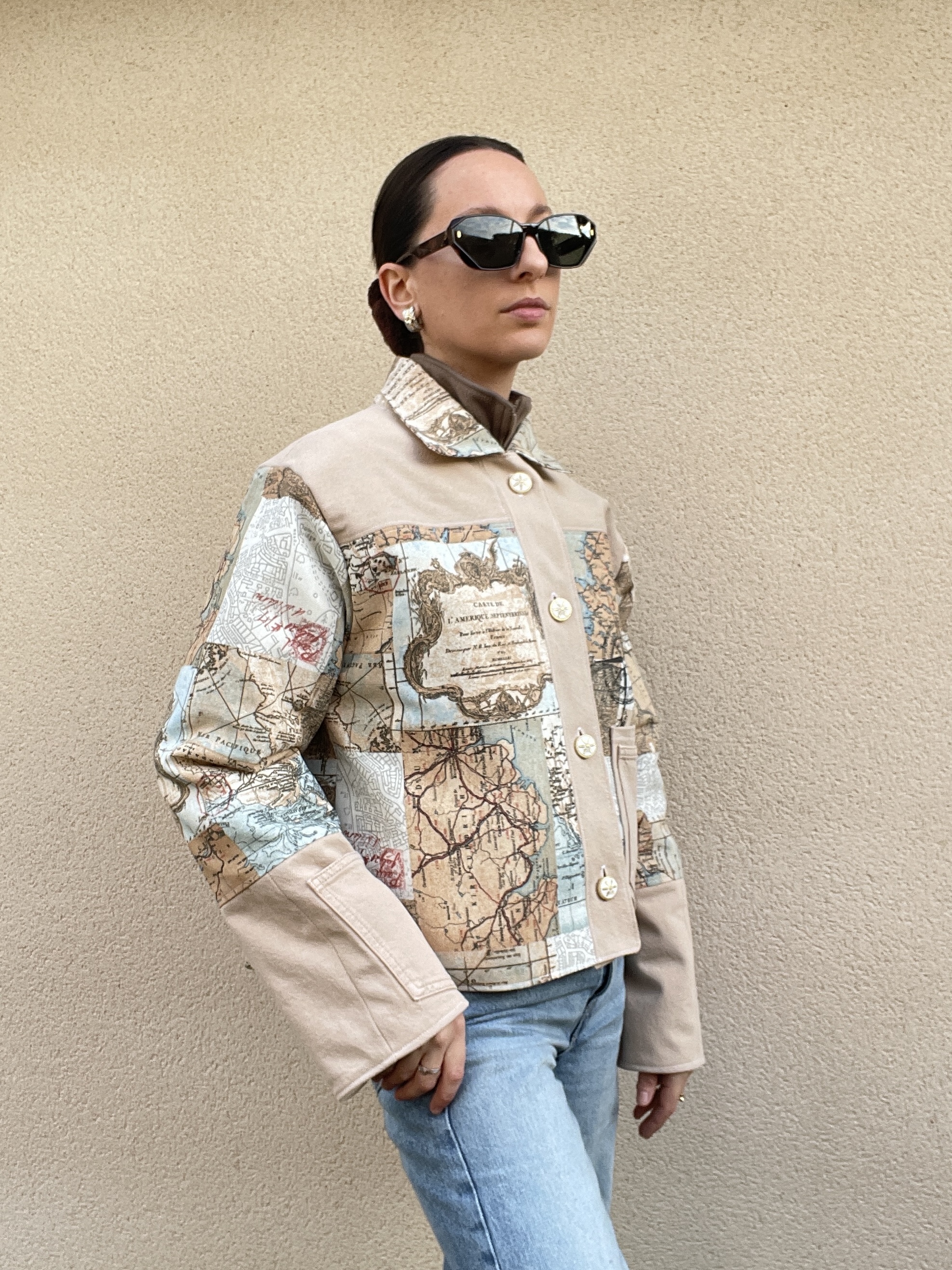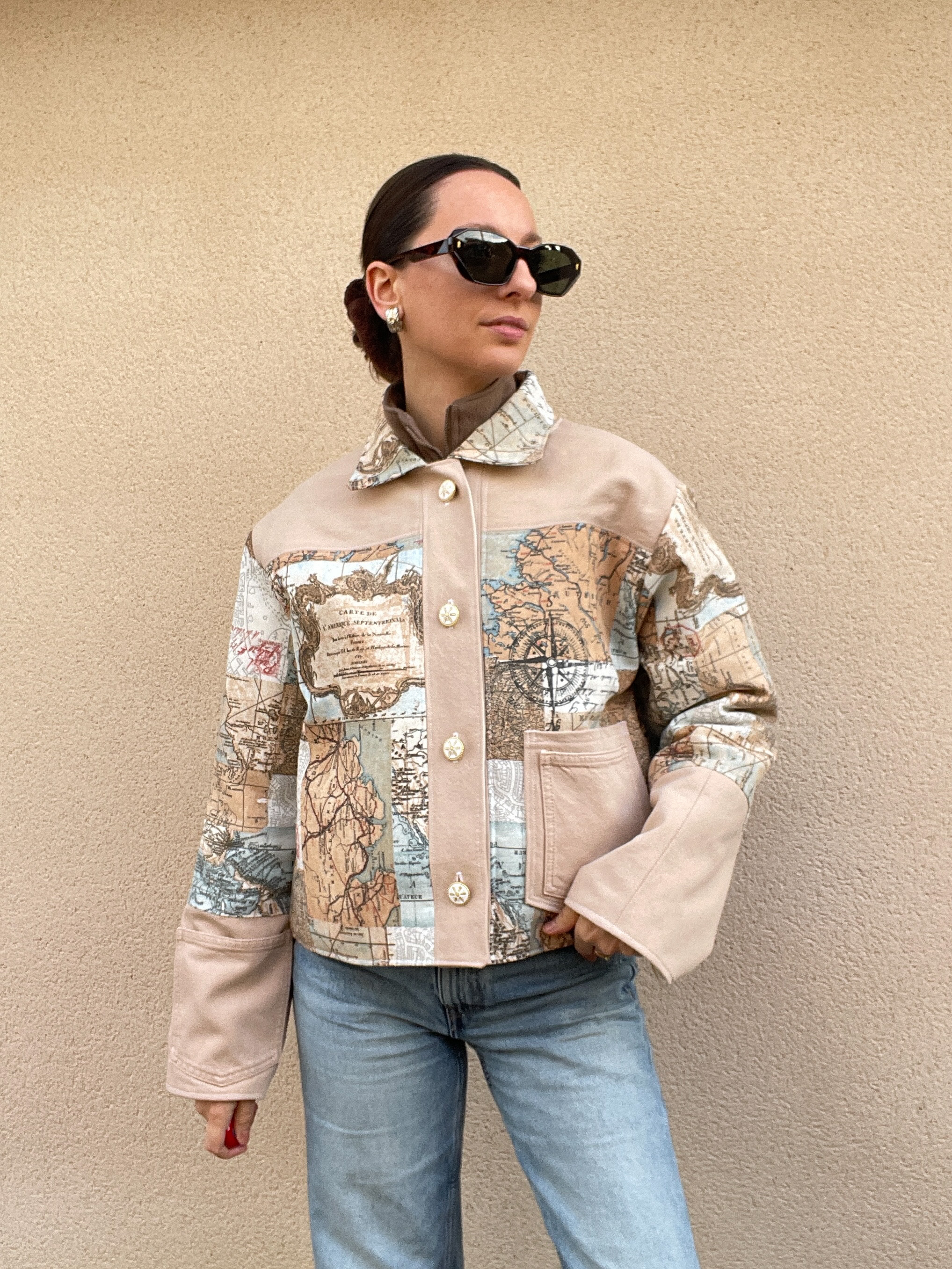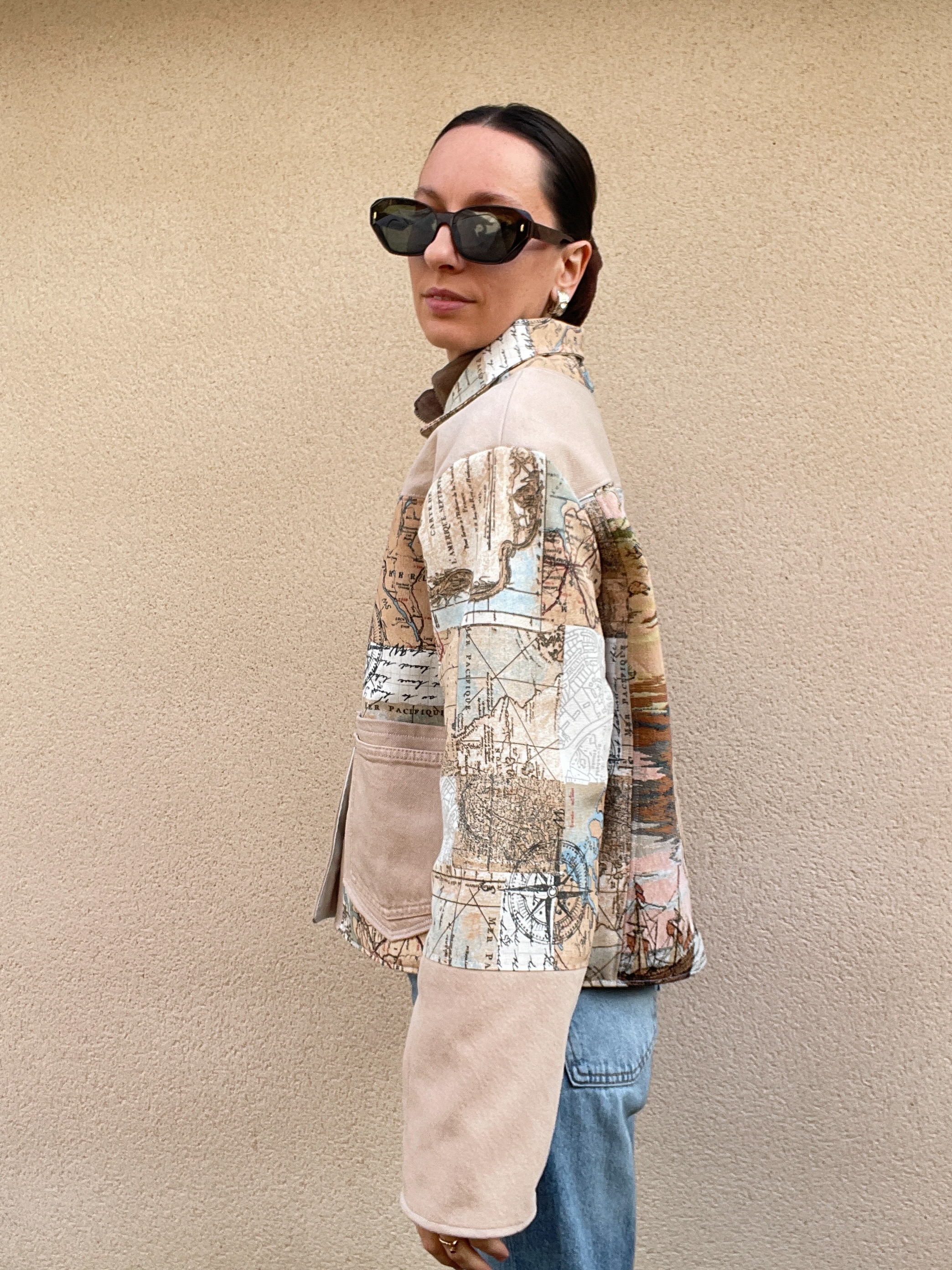 Patchwork de jean et de toile de coton à l’imprimé carte du monde